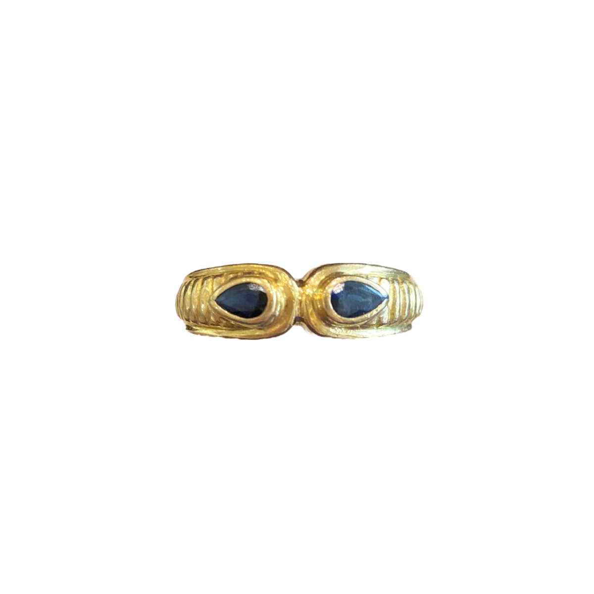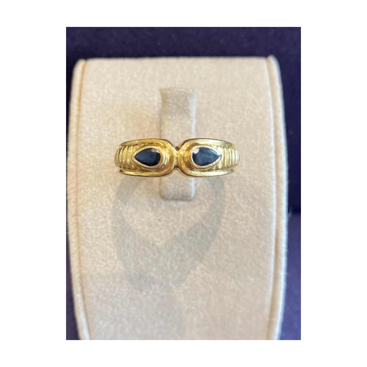 Geelgouden ring bezet met twee peergeslepen saffieren in een gesloten zetting, de zetting met een gekartelde rand. In de stijl van Ilias Lalaounis. ca. 1980 Metaal: 750°/°° (18K) geelgoud Soort stenen: twee peergeslepen saffieren TDD 51 Totaal brutogewicht 2,7 gr Ref. 31200013