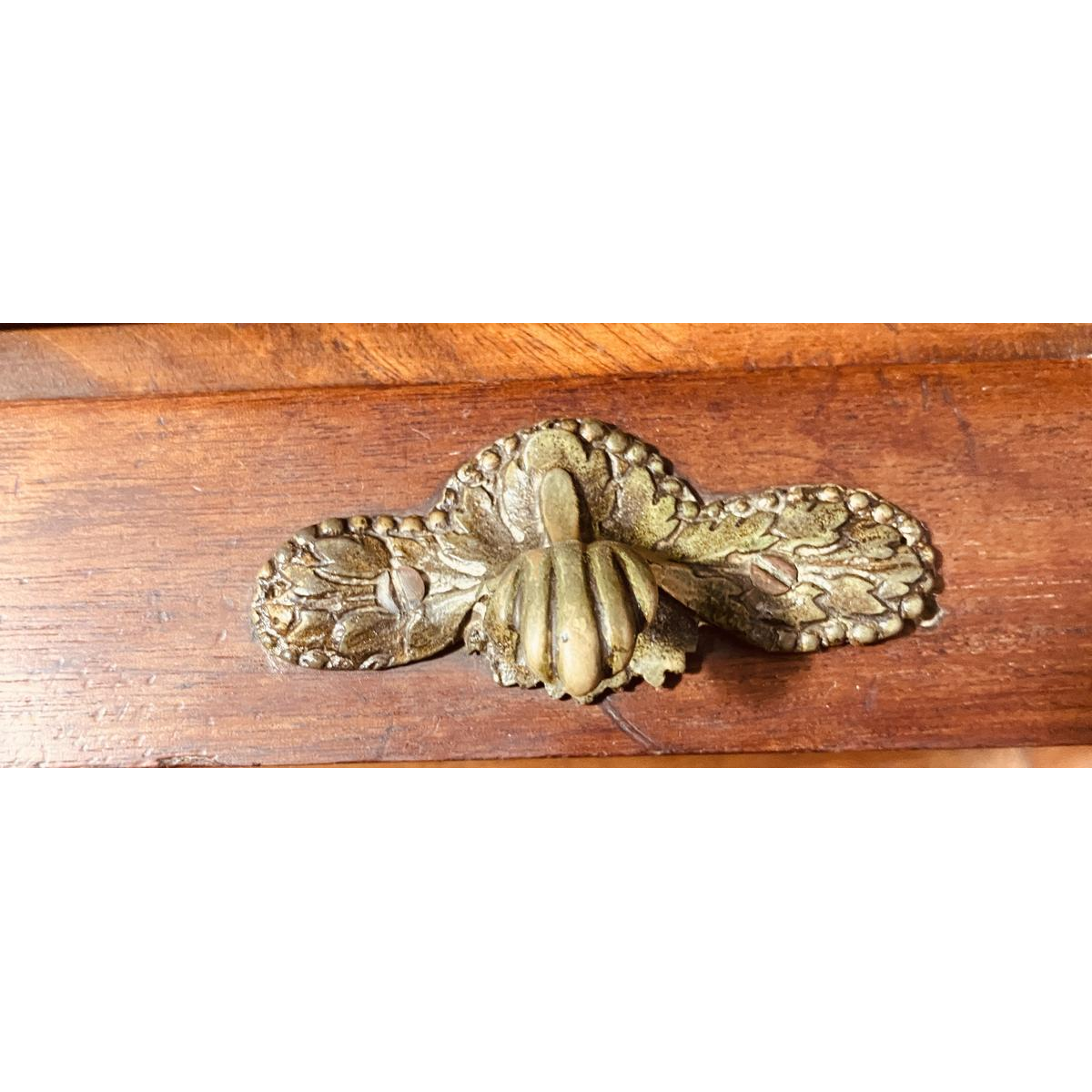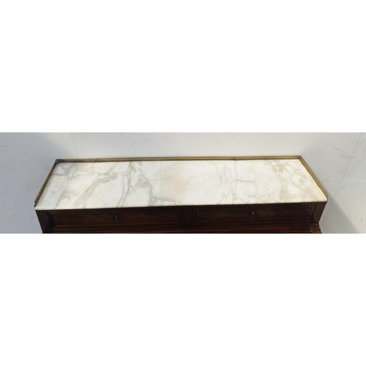 Het rust op vier gecanneleerde spijlenpoten, versierd met ringen en eindigend in verguld bronzen kappen.