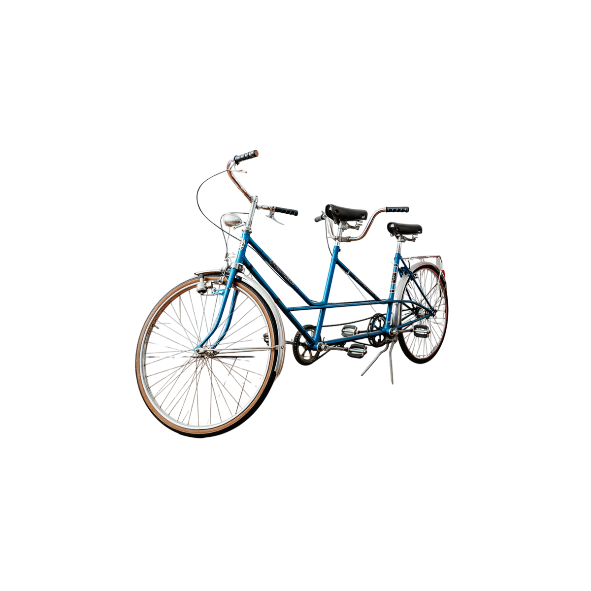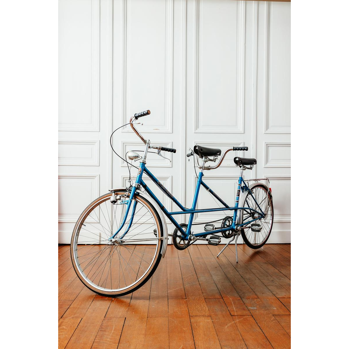 Blauw gelakt stalen frame, chromen details, zwarte lederen zadels en metalen spatborden.