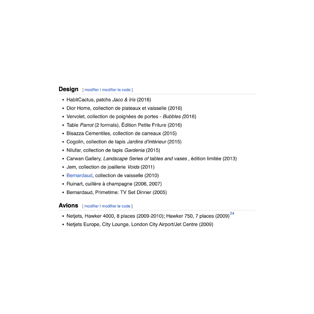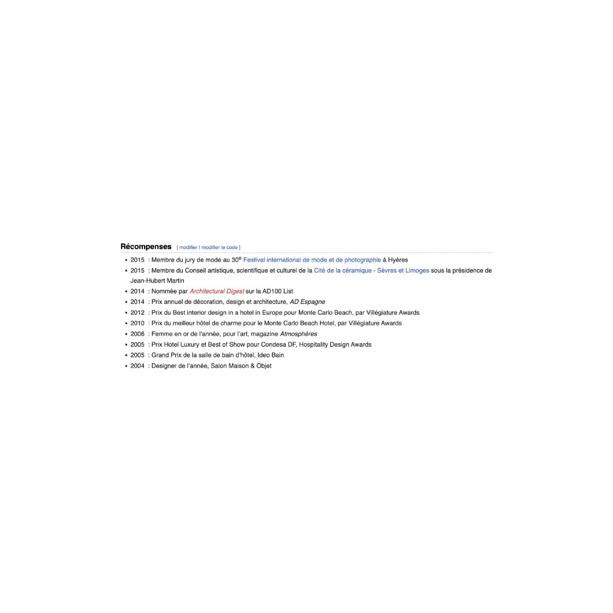 Sinds het begin van haar carrière in de jaren 1990 hebben haar projecten op het gebied van binnenhuisarchitectuur een stijl ontwikkeld die geassocieerd wordt met een bepaalde visie op geluk en kleur, die ze in belangrijke mate nieuw leven heeft ingeblazen. Ze heeft gewerkt met Maja Hoffmann, de Beaumarly groep, Valentino, Ladurée, de Société des Bains de Mer de Monaco, Petite Friture, maar ook met Alber Elbaz en Adel Abdessemed. Ze heeft over de hele wereld privéresidenties ontworpen (Parijs, Londen, New York, Siwa [Egypte], Sydney), maar ook hotels, restaurants en boetieks. Haar objecten, te beginnen met de Bishops, zijn iconen van de hedendaagse decoratieve kunst.