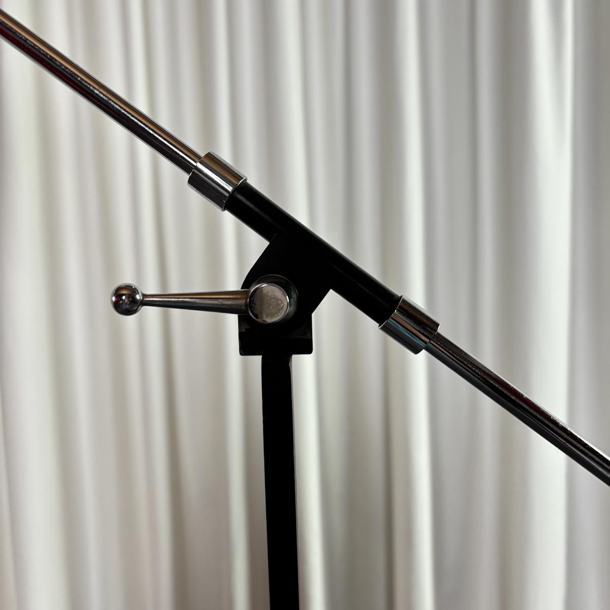 Deze slanke, verstelbare staande lamp verkeert in goede vintage staat, hoewel hij tekenen van slijtage en patina vertoont die passen bij leeftijd en gebruik. Let op de putjes in het frame, de patina op de zwarte lak en een lichte vervorming van de rand van de metalen kap.