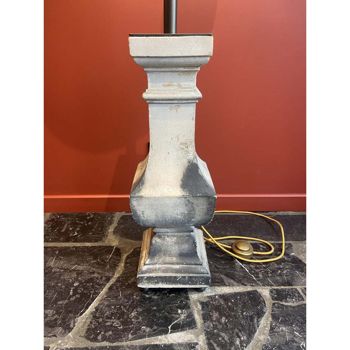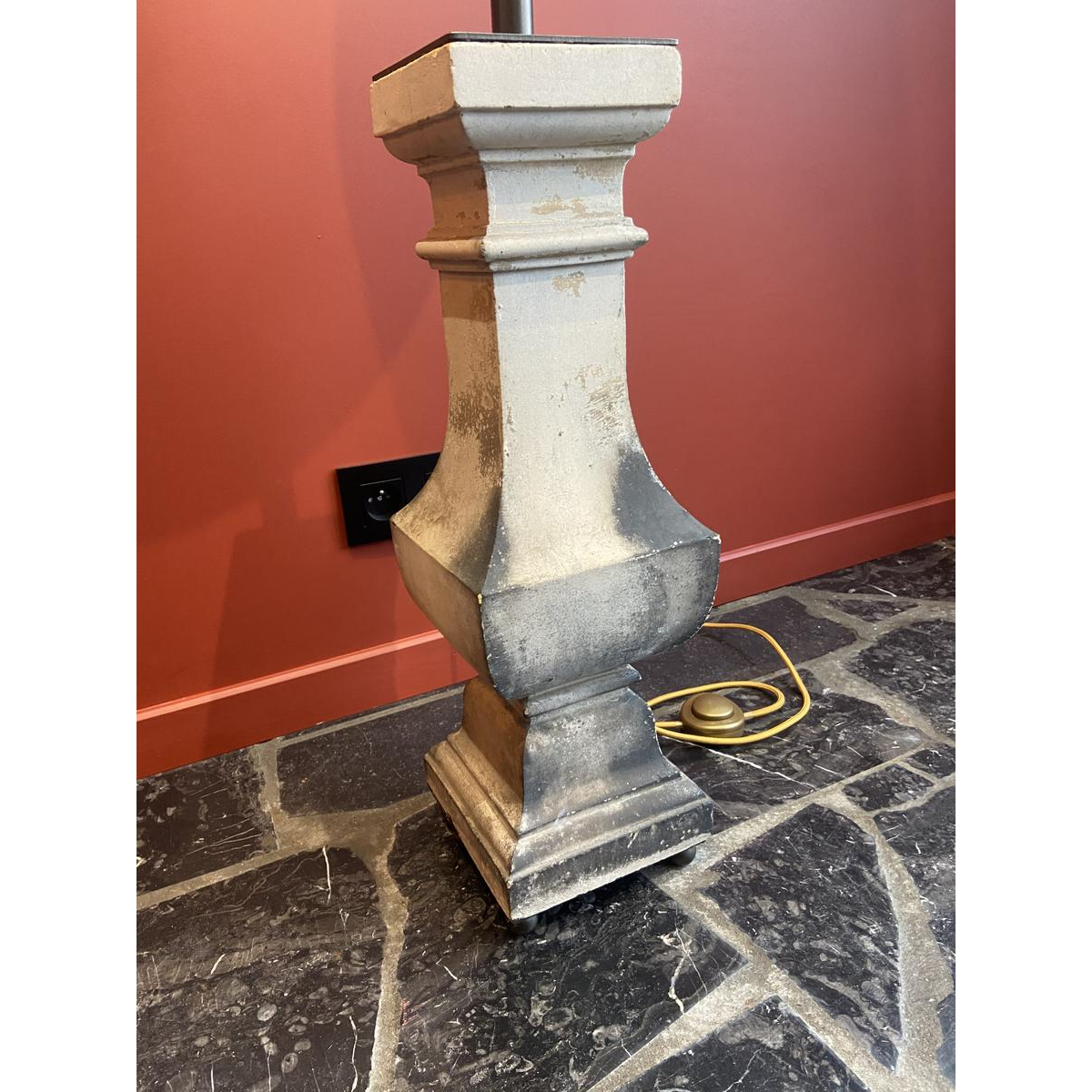 Staande lamp: Stijl: Overig, Materiaal: Terracotta, Hoofdkleur: Grijs, Kabel: Goudkleurig textiel - ca. 180 cm, Fitting: E-27 messing, Totale afmetingen (b+b): 156,0 cm, Details: Terracotta. Antiek. Voormalig balustrade-element van een kasteel, omgebouwd tot lampvoet. Gemonteerd op een donkerbruin gelakte metalen voet.
