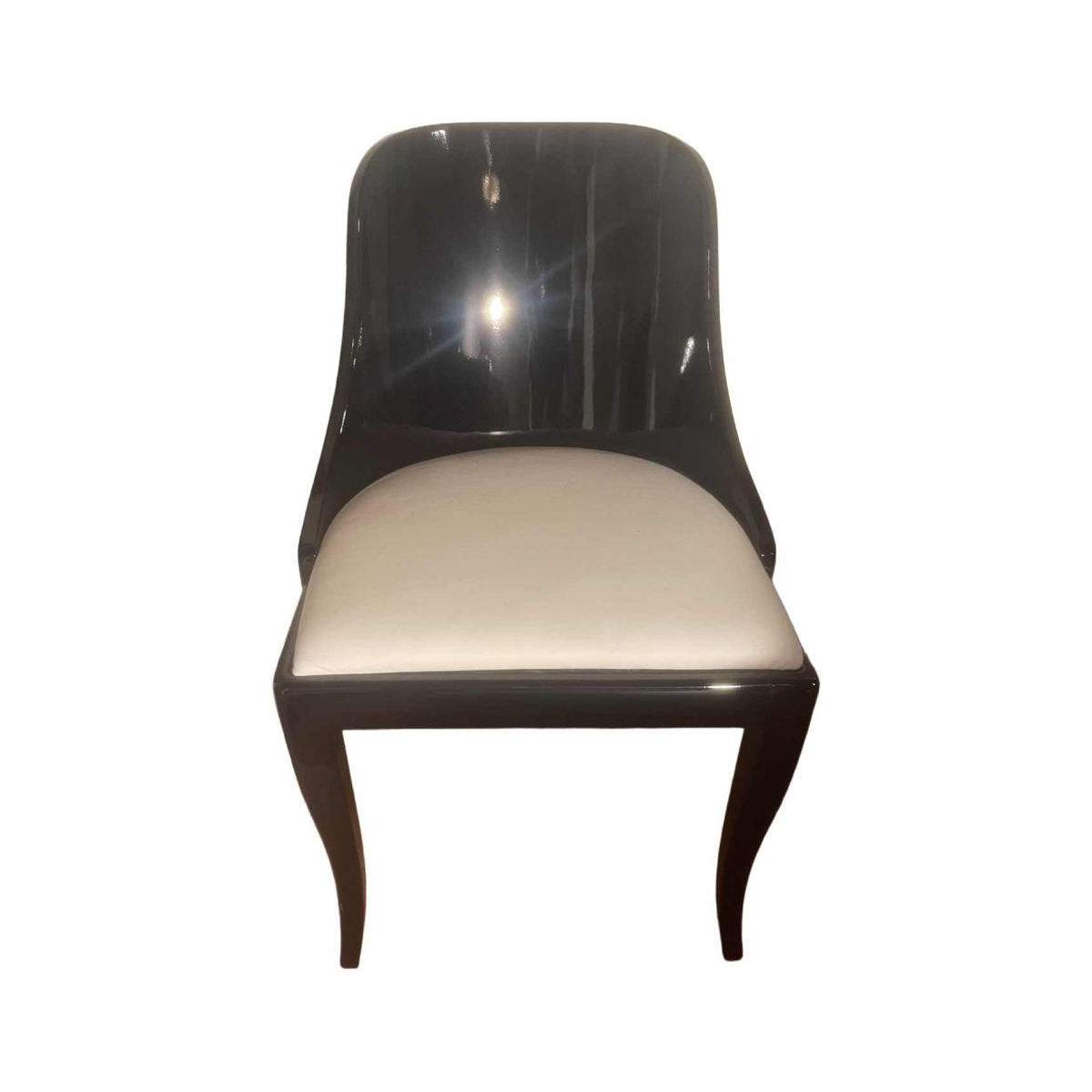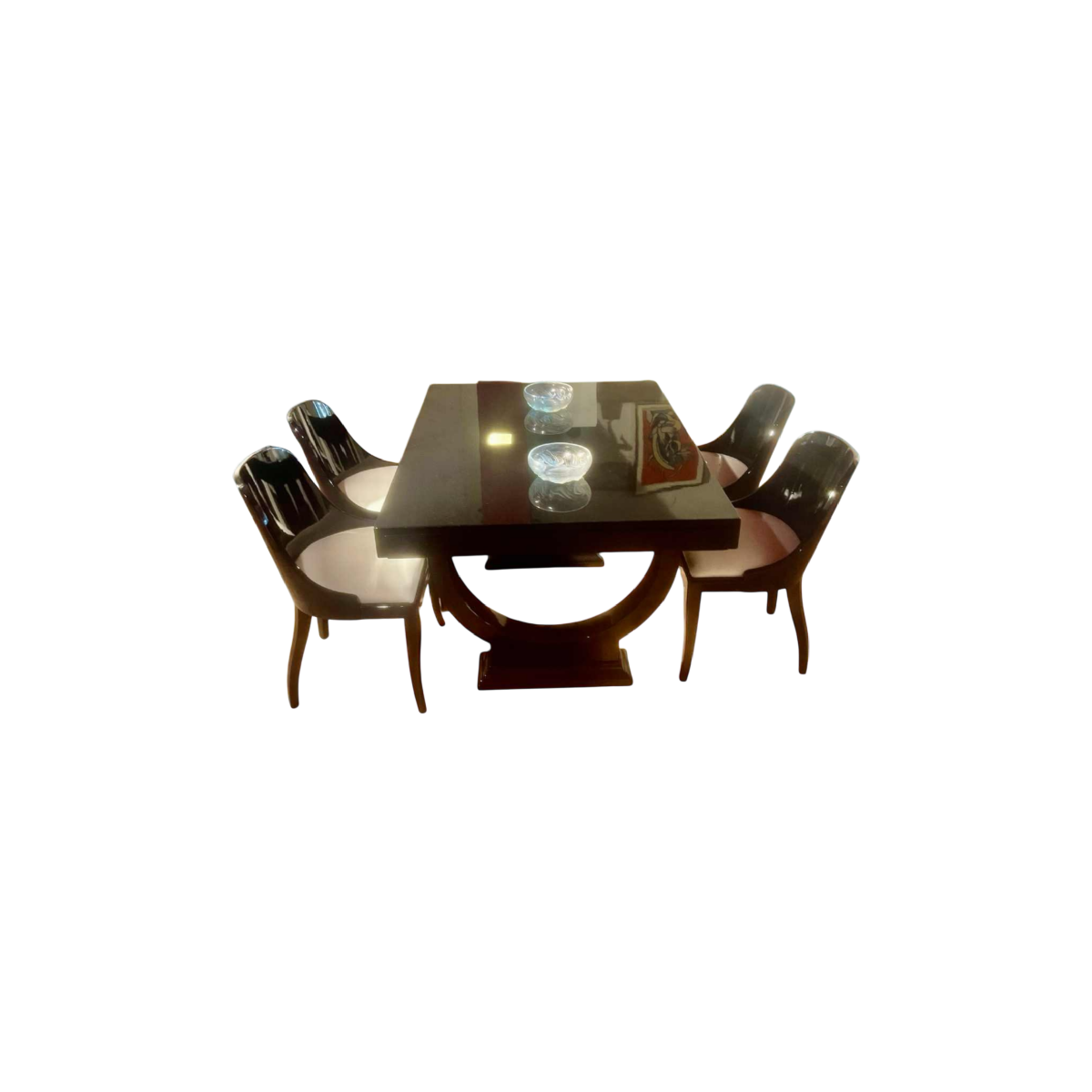 De 6 art deco stoelen zijn in dezelfde kleur als de tafel hoogglans zwart gelakt.