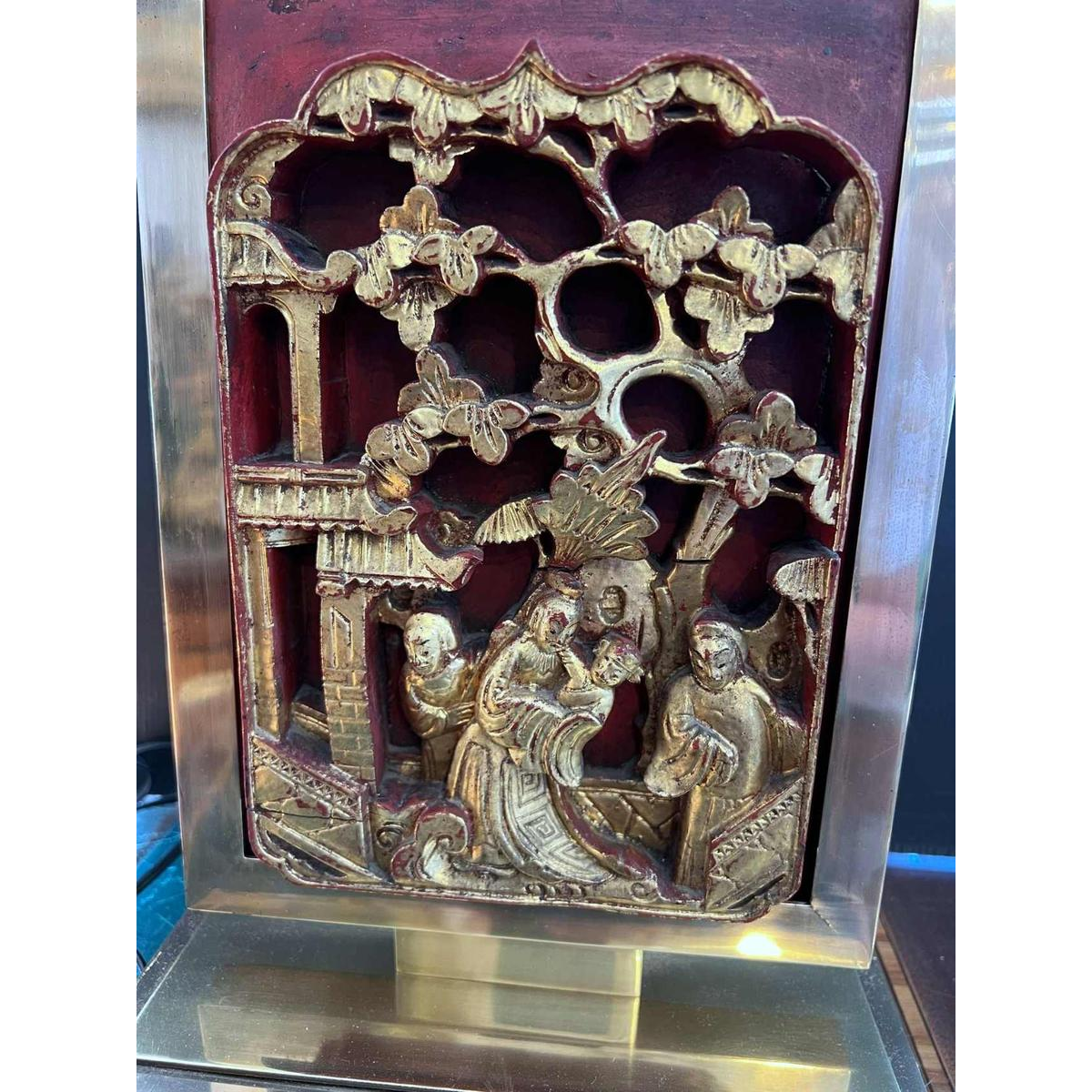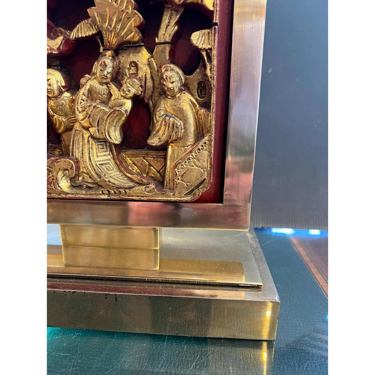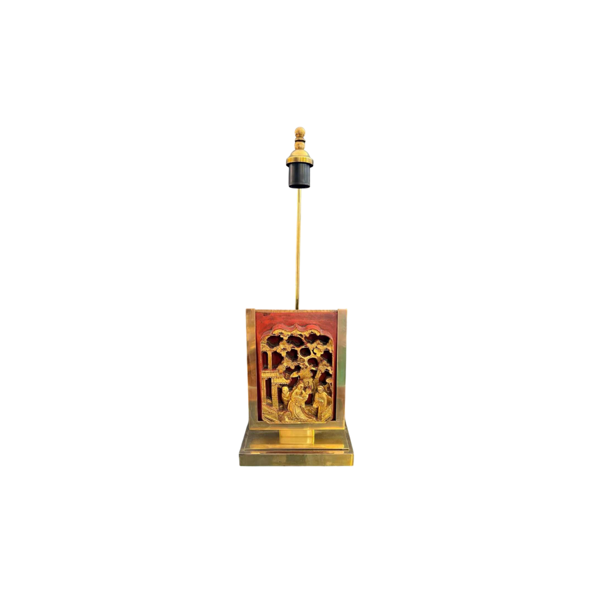 Een verguld messing tafellampje in Chinese stijl met een uitgesneden rood gelakt en verguld paneel.