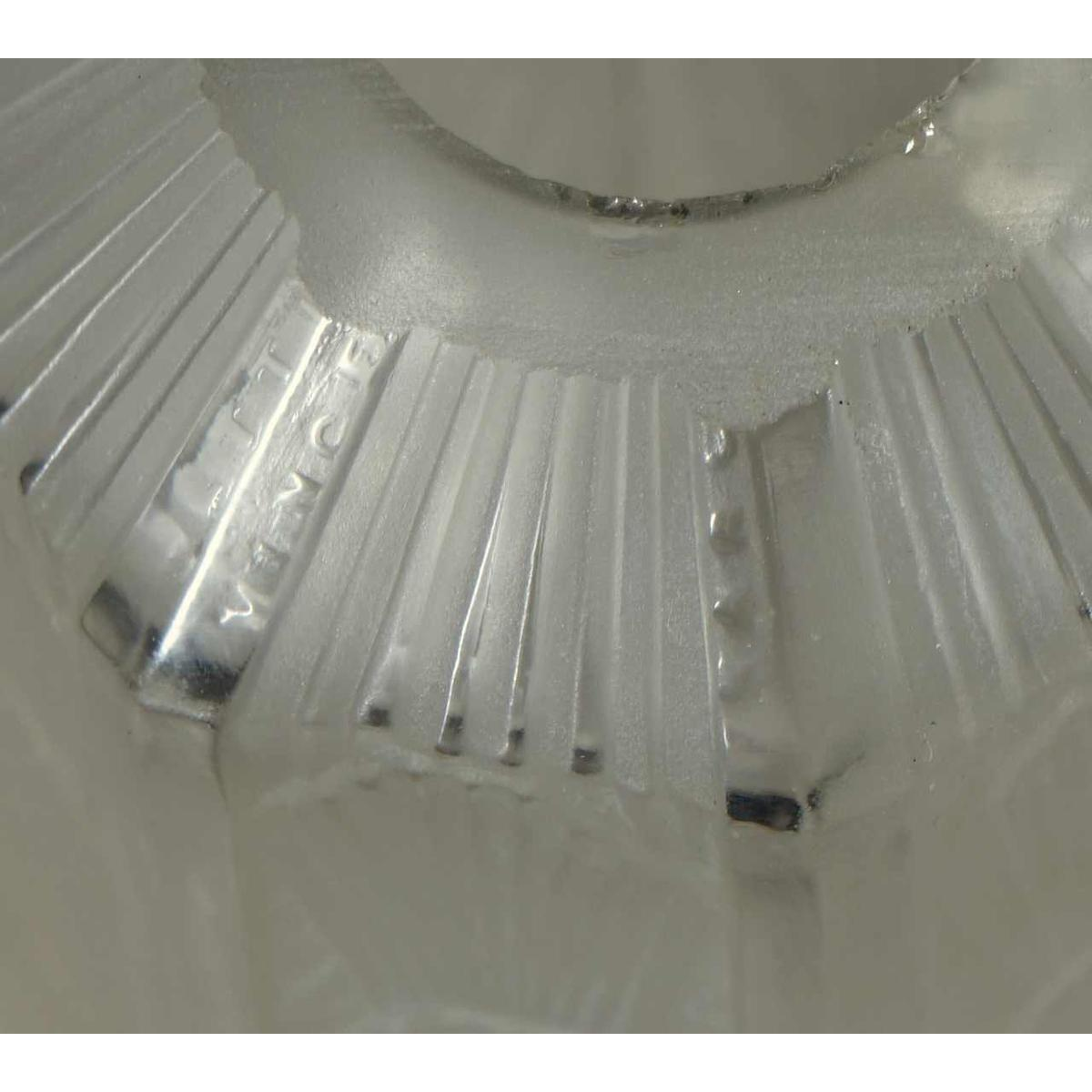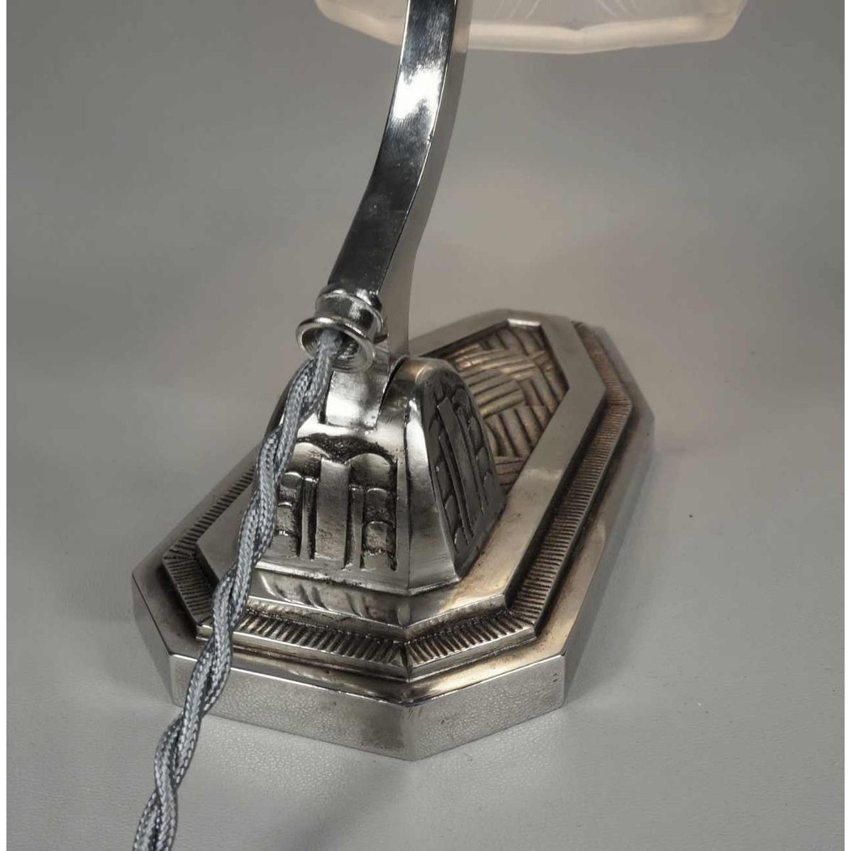 Een prachtige Franse art deco lamp in vernikkeld brons en geperst glas. Het glas is gesigneerd 'Hettier Vincent France' en werd voor H&V gemaakt door verreries des Hanots. De fraaie lampvoet is zo gemaakt dat de lamp zowel als tafellamp en als pianolamp gebruikt kan worden. Hij is ongeveer 29 cm hoog en de voetplaat meet 18 x 8,7 cm. De lamp is in uitstekende staat. Ik heb de voet opnieuw vernikkeld en gepatineerd. De lamp is opnieuw bedraad en voorzien van een E14 fitting, zodat onze moderne lampjes bruikbaar zijn, ik zal een LED lampje van goede kwaliteit meeleveren