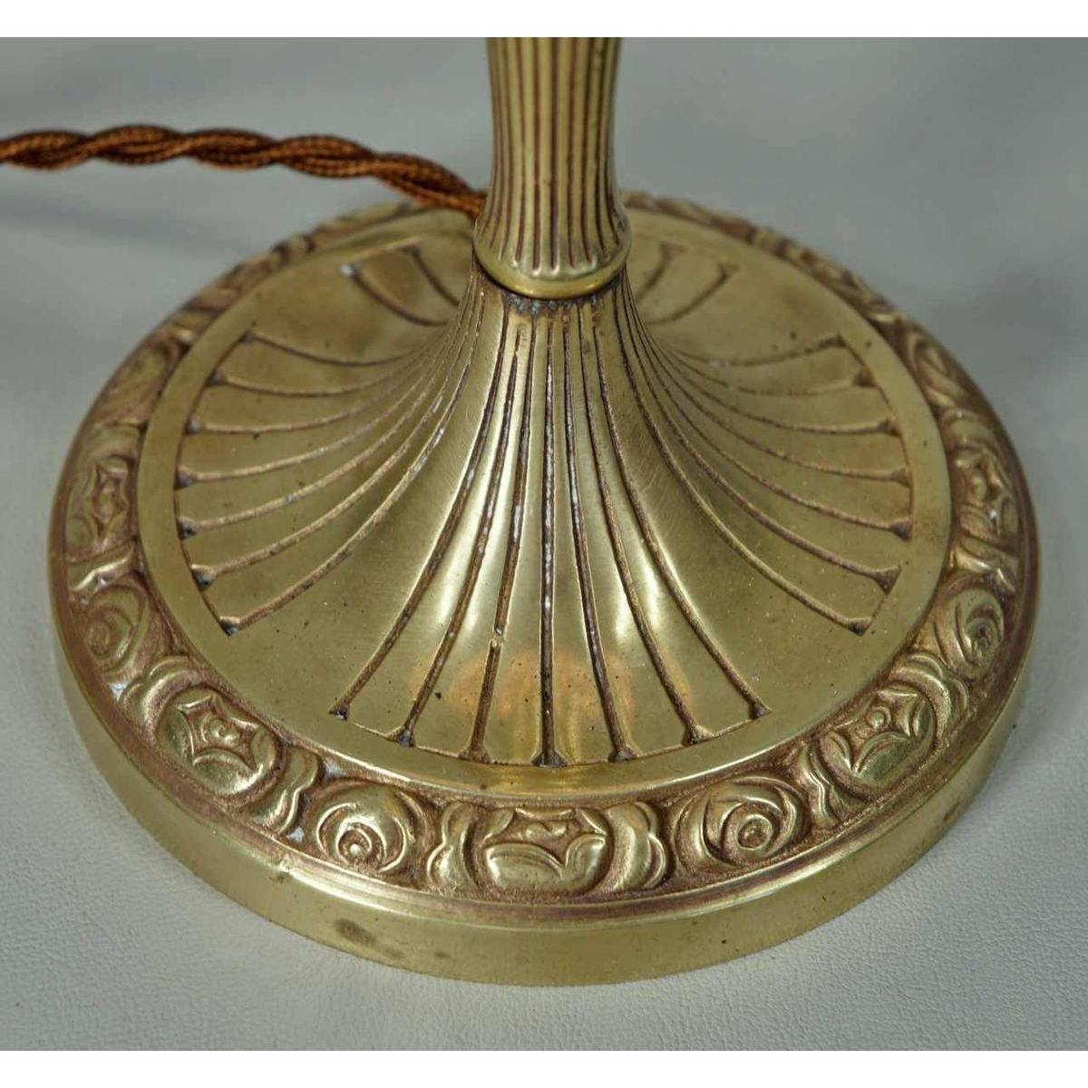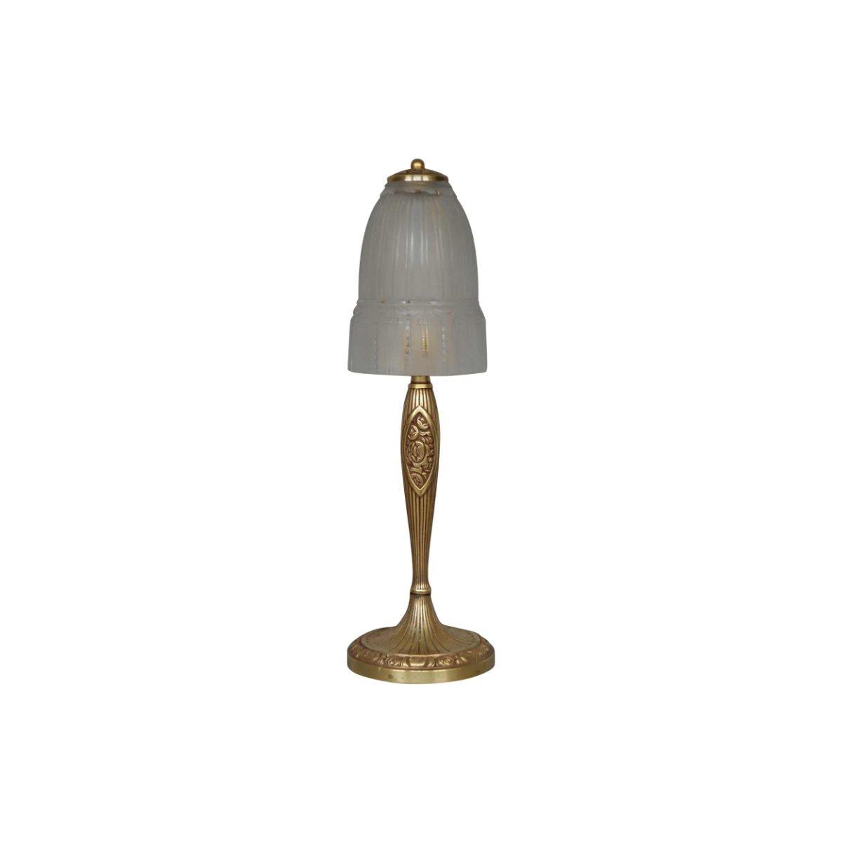 Een prachtige Franse art deco lamp uit rond 1925 in brons en geperst glas. De lamp werd gemaakt door Léon Richard en voorzien van een prachtig glazen kapje van Muller freres. Richard verkocht de lampen ook met stoffen lampenkappen en met kapjes in albast, De lamp heeft een hoogte van 37,5 cm en is in uitstekende staat. De lamp is voorzien van nieuwe bedrading, getordeerd stof omwikkeld snoer, en een E14 fitting.