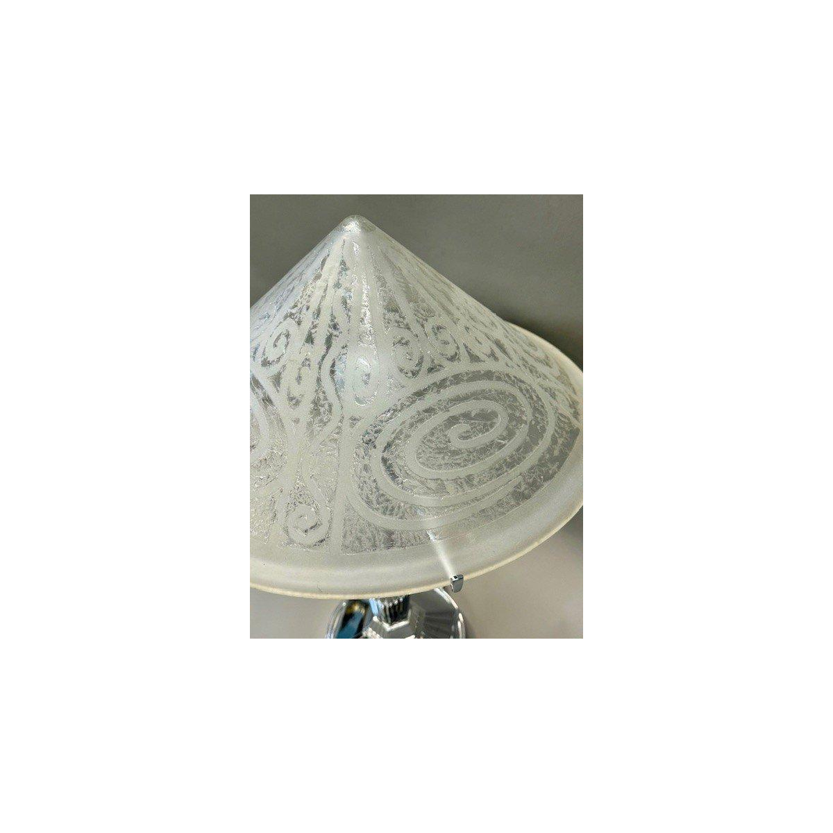 Een originele lampenkap van geperst glas, gegraveerd in de stijl van Daum, een opnieuw verchroomde voet.
