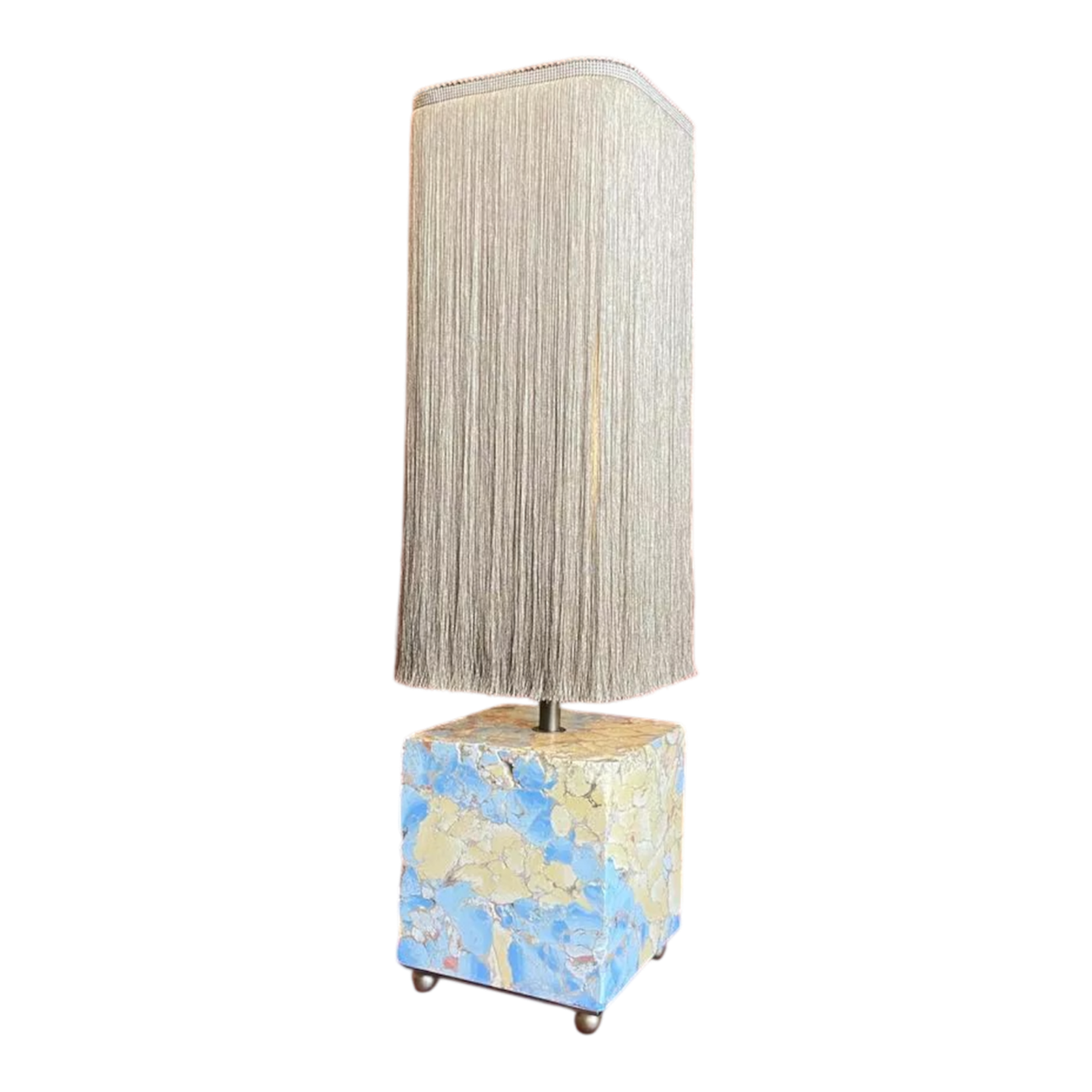 Deze handgemaakte lamp is een unieke creatie uit België. Hij onderscheidt zich door de kwaliteit van de materialen (franjes, marmer-pleistereffect) en de eigentijdse stijl. De lampenkap, gemaakt van Houles franjesstof, voegt textuur, verfijning en een warm, diffuus licht toe. De lampvoet zorgt voor een elegante en stabiele structuur. De lamp is recent bedraad en kan direct worden geïnstalleerd en gebruikt. Samen vormen ze een opvallend decoratief object, ideaal om een eigentijds, klassiek of eclectisch interieur te verfraaien met een authentieke, handgemaakte touch.