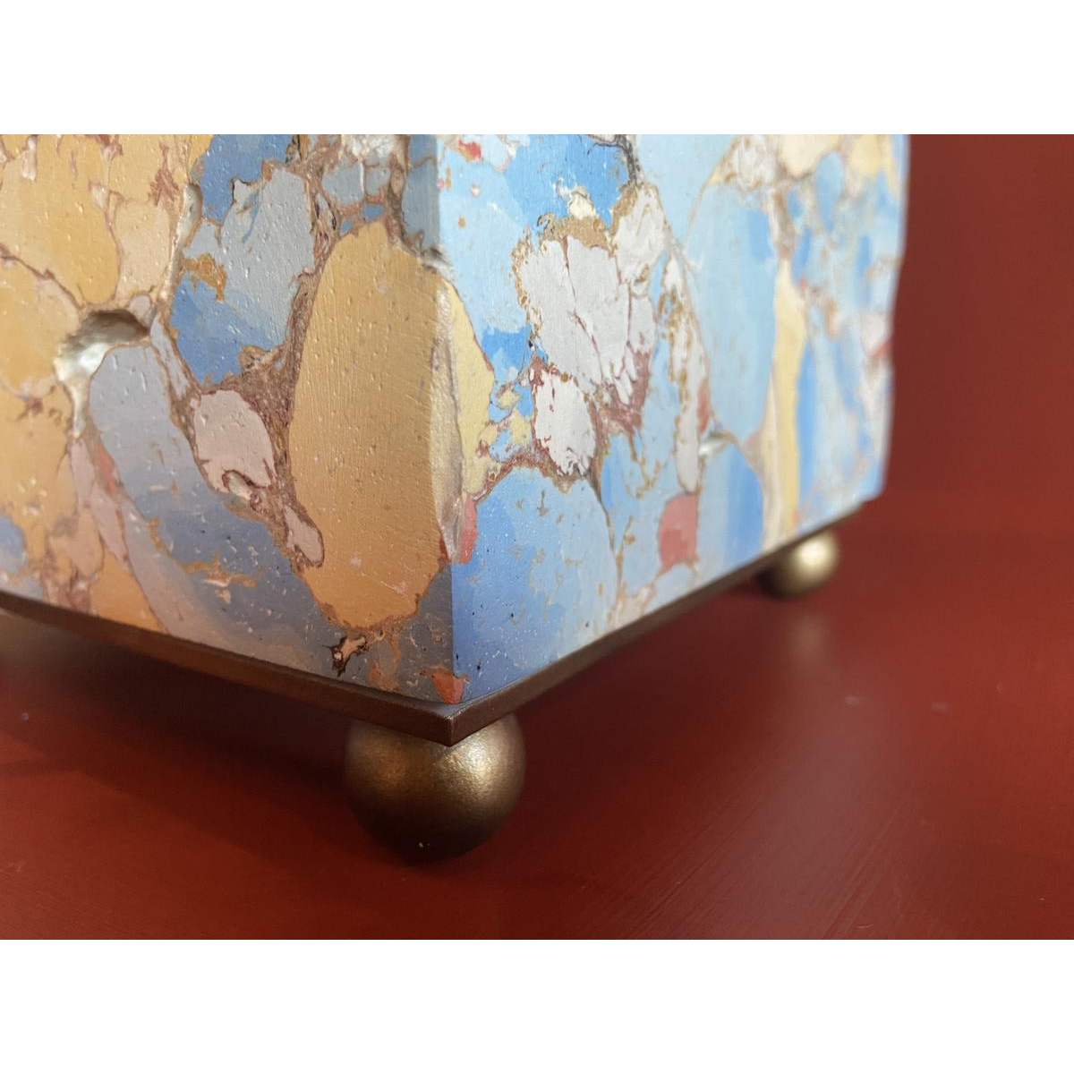 Nacht- en tafellamp: Stijl: Hedendaags, Materiaal: Marmer-stucwerk, Hoofdkleur: Beige en blauw, Kabel: Witte stoffen - ronde kabel - ca. 150 cm, Fitting: E-27 wit bakeliet, Totale afmetingen (a+d) (cm): 78,0, Gewicht (kg): 5,0, Details: Marmer-stucwerk door mijzelf gemaakt. Daarop is een transparante waslaag aangebracht. Volledig handgemaakt. De kubus staat op een brons-goudkleurige metalen voet. Uniek exemplaar in deze kleur. Lampvoet van marmer-stucwerk, volledig door mijzelf gemaakt. Daarop is een transparante waslaag aangebracht. De kubus staat op een brons-goudkleurige metalen voet. Uniek exemplaar.