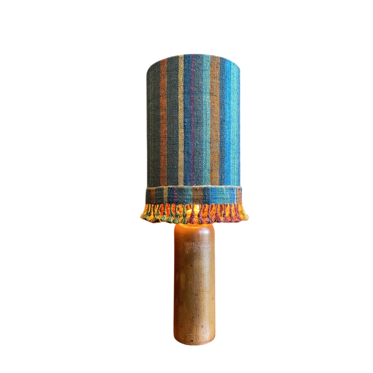 Lamp in de vorm van een "stenen fles" met een blauwe en veelkleurige lampenkap, handgeweven in India.