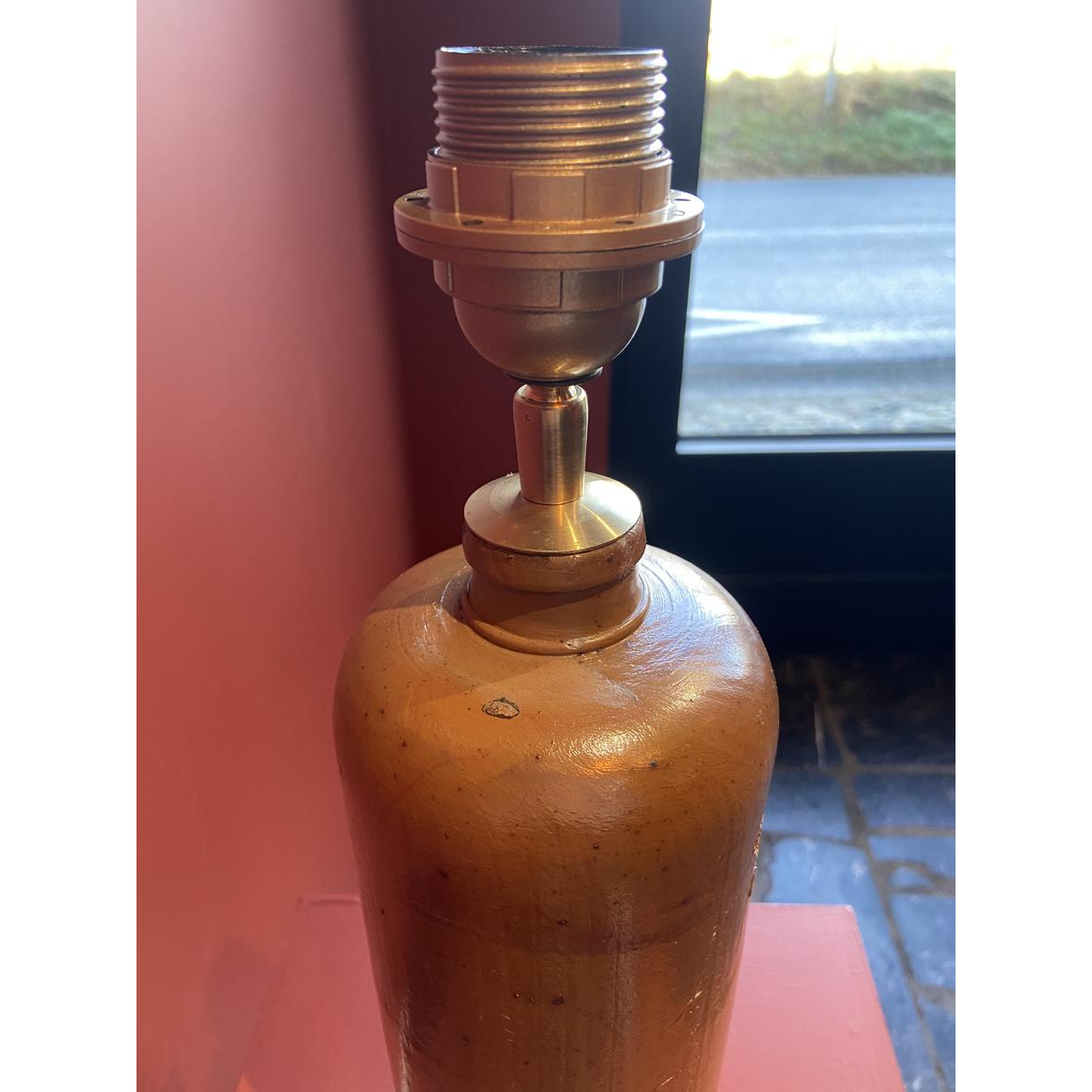 Nacht- en tafellamp: stijl: vintage, materiaal: keramiek, hoofdkleur: oranje-bruin, kabel: gedraaid stoffen snoer - ca. 220 cm, fitting: E-27 in goudkleurig bakeliet, totale afmetingen (b+p) (cm): 70,0, gewicht (kg): 1,5, details: Antieke aardewerken fles, Gin. Genever, Amsterdam. Omgevormd tot lampvoet.