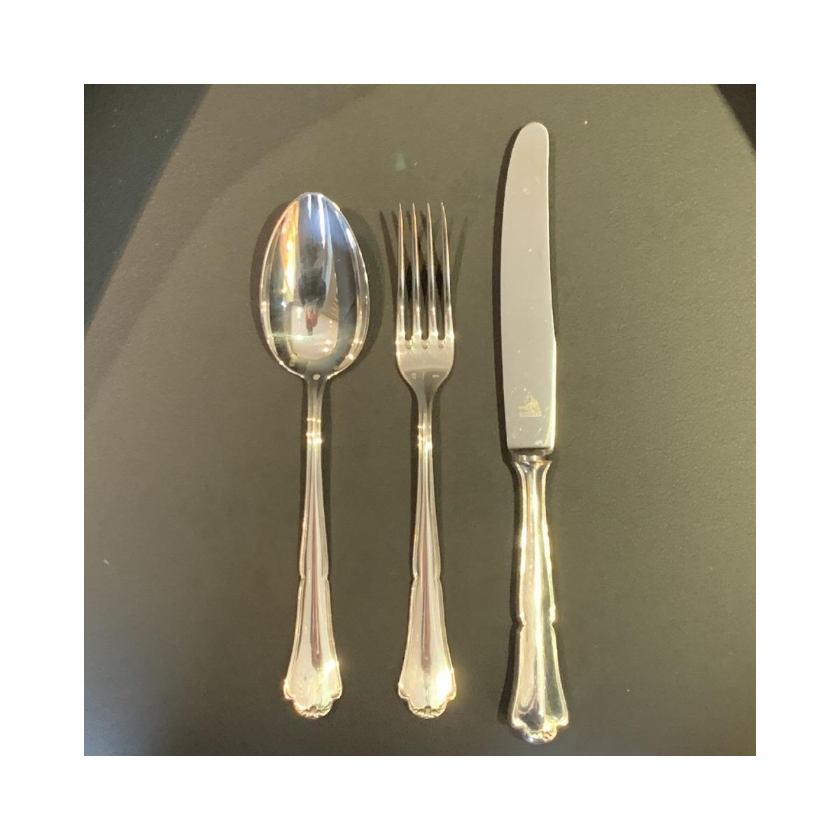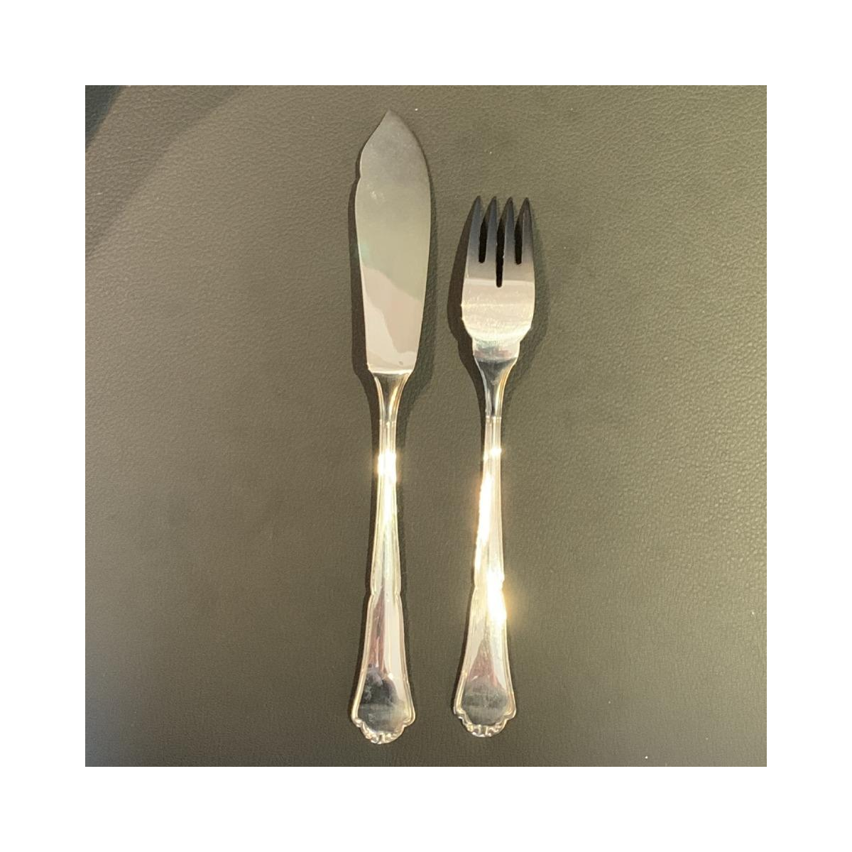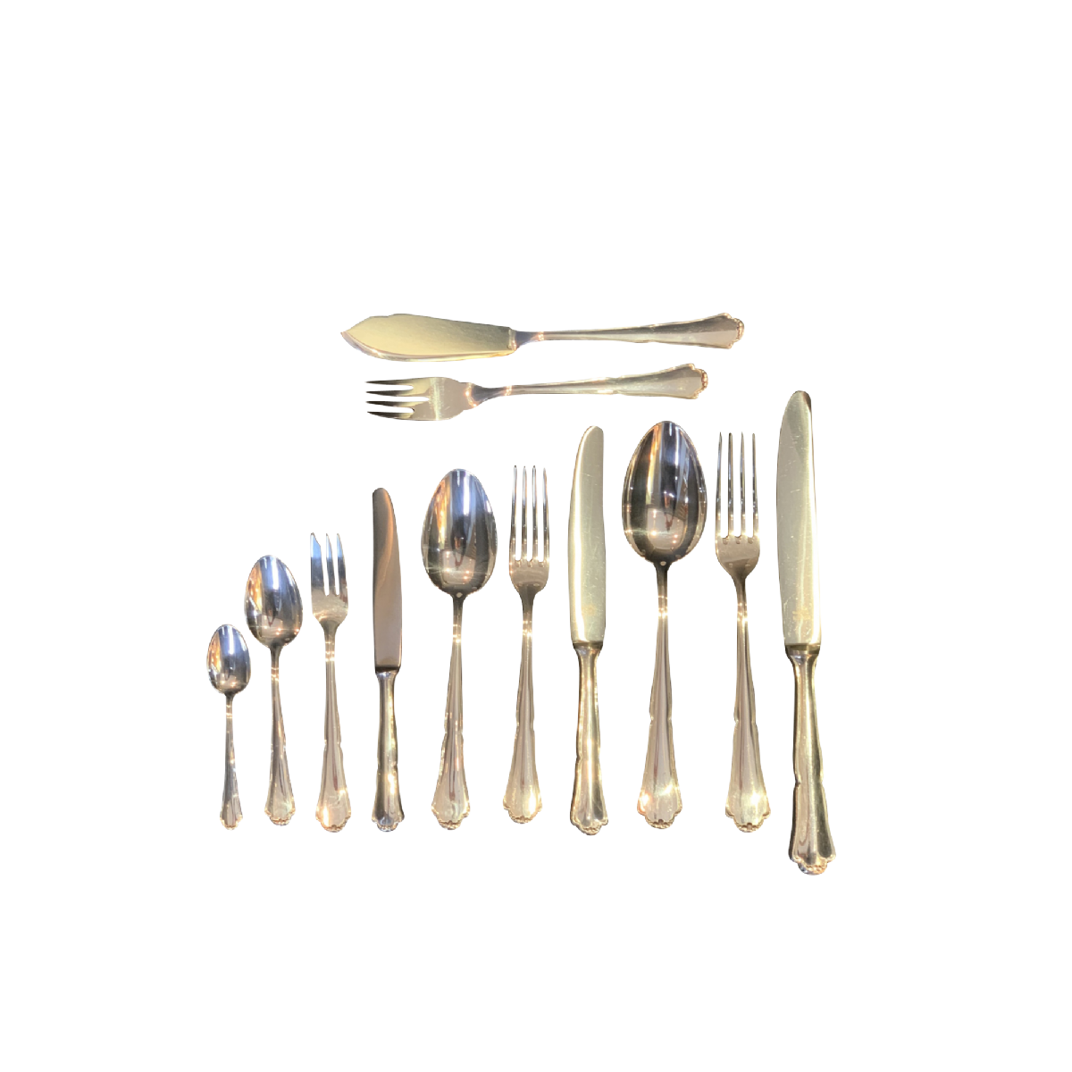 Zeer complete bestekset van massief Belgisch zilver (800/1000). 12 grote messen, vorken en lepels (36-delig). 12 vismessen en -vorken (24-delig). 12 dessertmessen, vorken en lepels (36-delig). 12 dessertmessen, vorken en lepels (36-delig). 12 theelepels en 12 diverse serveerstukken (opscheplepel, sauslepel, taartschep, enz.). Het totale gewicht is ongeveer 7 kg 300. Als we de messen (36-delig) waarvan het lemmet niet van zilver is, verwijderen, houden we ongeveer 5 kg 250 aan massief zilver over met een gehalte van 800/1000. De vraagprijs komt overeen met € 30 per stuk, met uitzondering van de 12 theelepels, die voor € 15 per stuk worden gerekend.