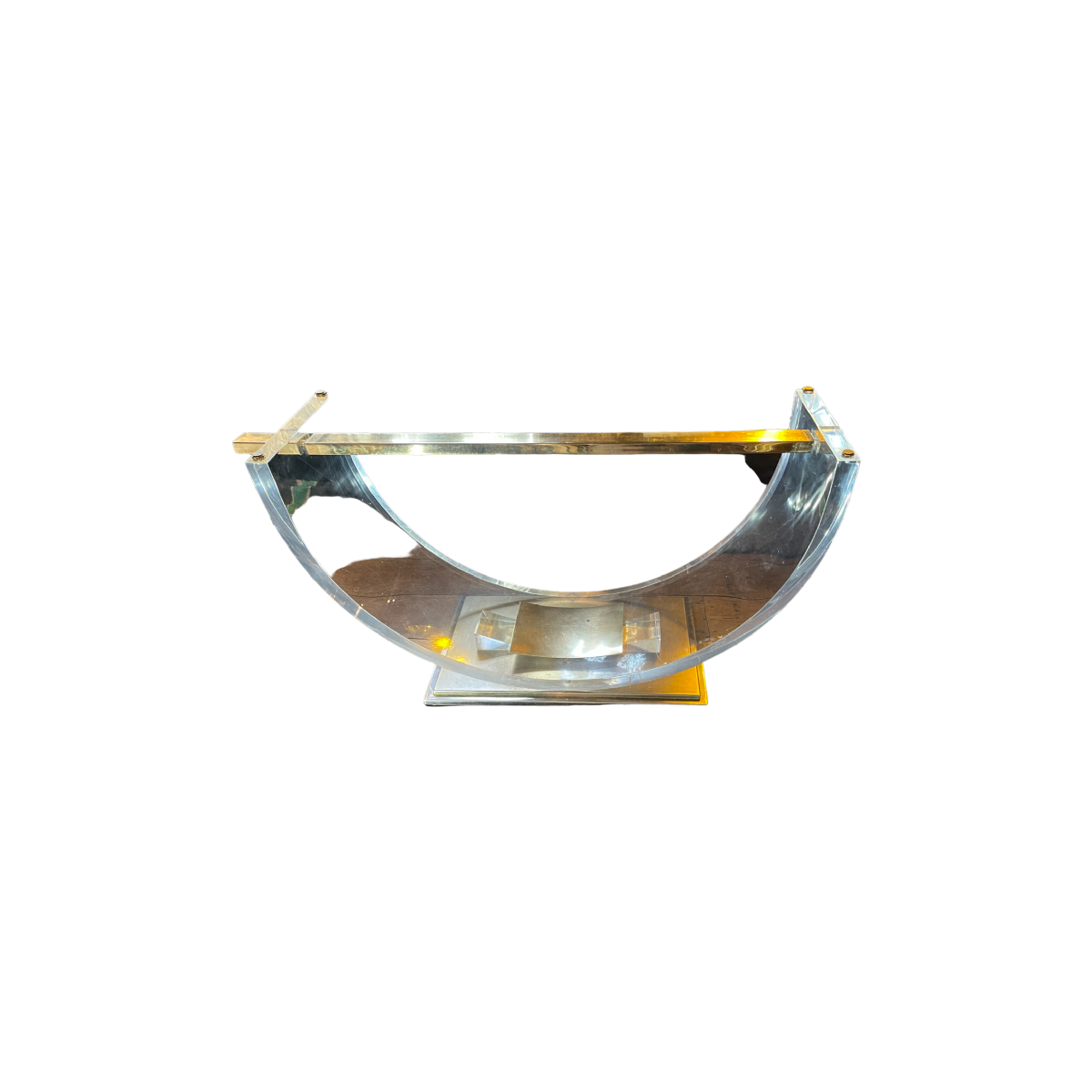 Frame van plexiglas, gietijzeren onderstel bekleed met chroom en messing staal, glazen blad.