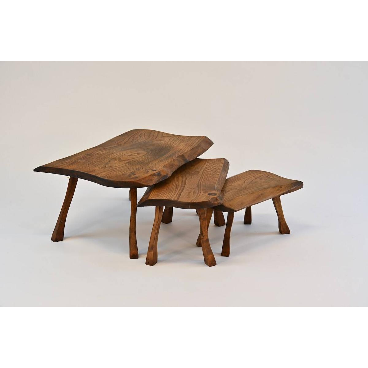 Brutalistische, in elkaar schuifbare tafels van eikenhout met een bijenwasafwerking.