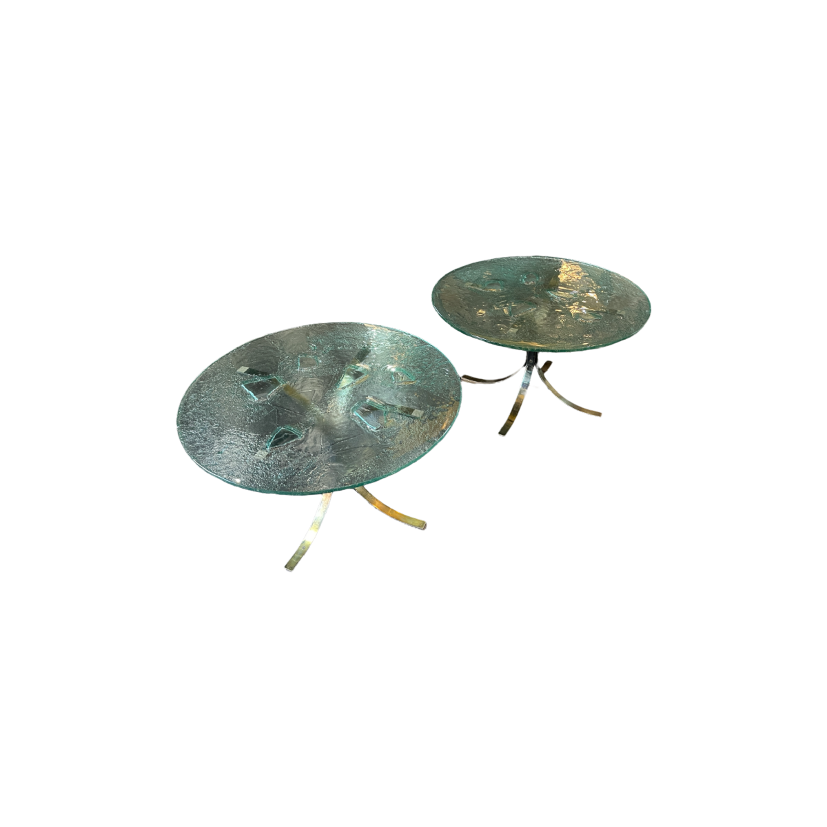 Paar ronde salontafels, Brutalistisch kunstglas, ca 1970/80