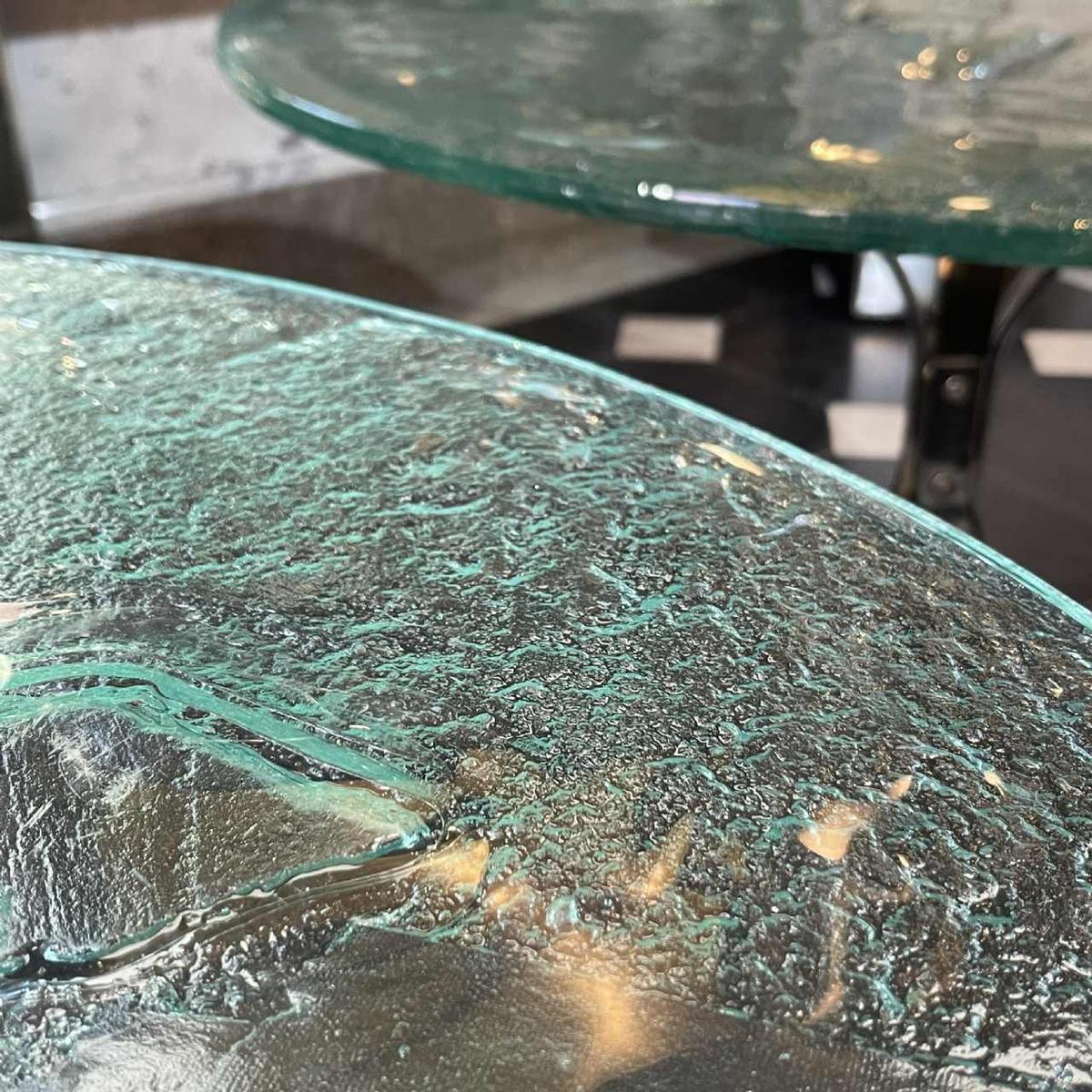 Ronde tafels van dik kunstglas met structuur in de "Ice Cube" stijl, werk van zeer hoge kwaliteit.