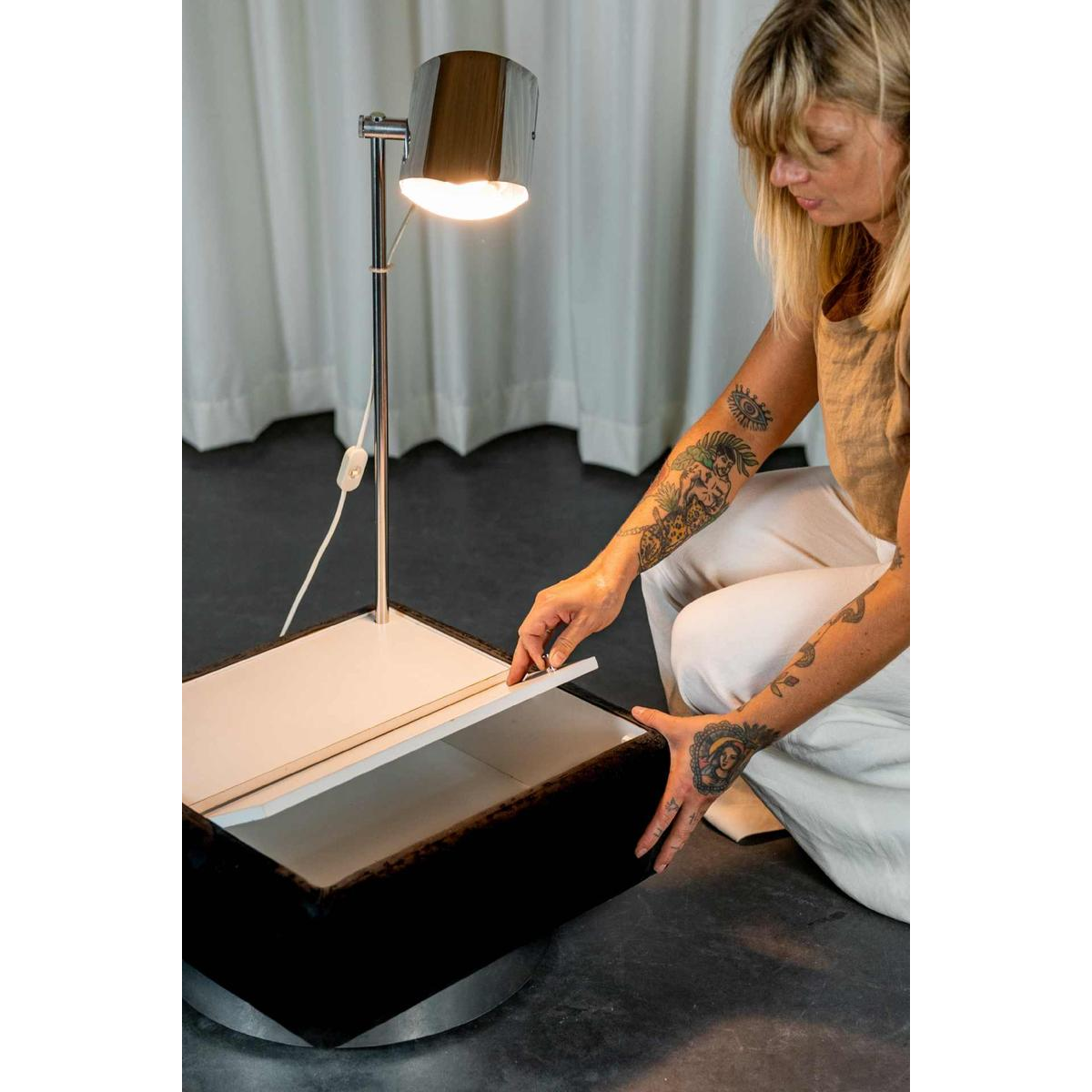 Set van twee bijzettafels bestaande uit een zwarte alcantara box op een chromen onderstel, een uitschuifbaar wit melamine blad en een chromen inzetlamp.