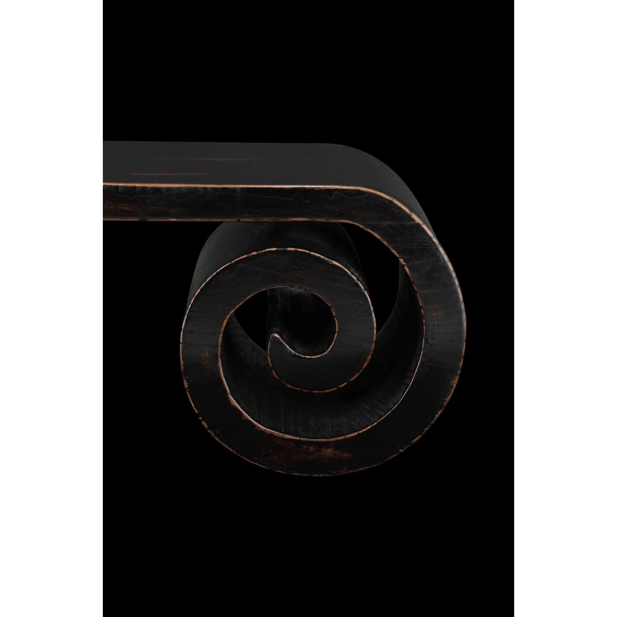 Vorm: De tafel heeft een rechthoekige vorm met opgerolde uiteinden in de vorm van voluten, een klassiek decoratief motief in de Chinese kunst.