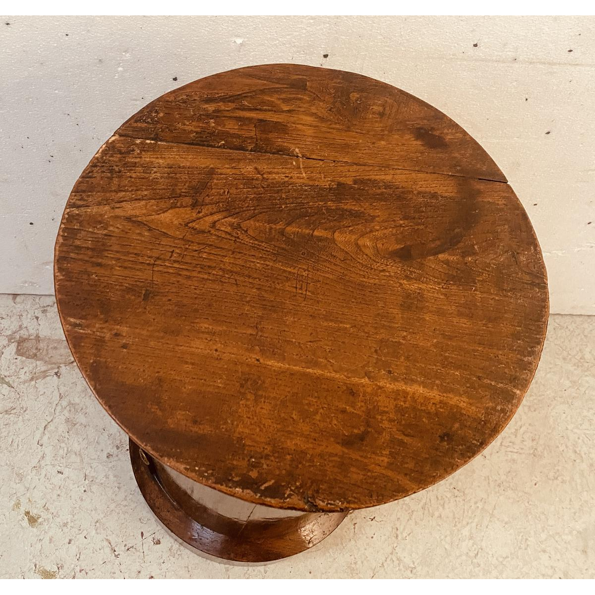 Een nachtkastje of bijzettafel in de vorm van een cilindervormige tafel met een gesloten gedeelte dat opbergruimte biedt.