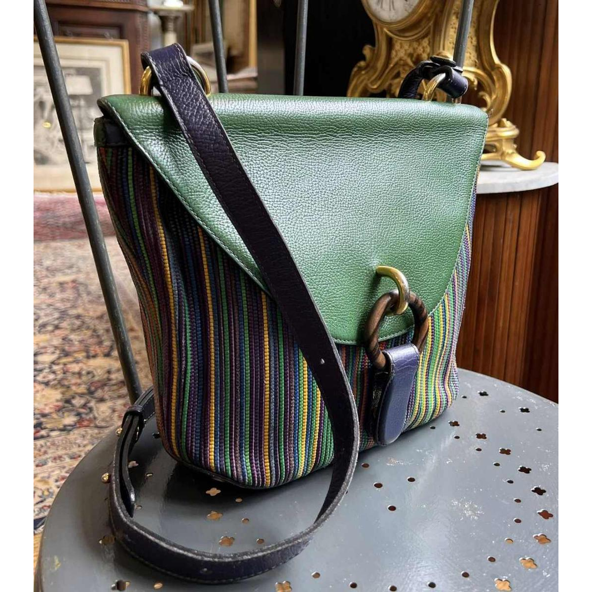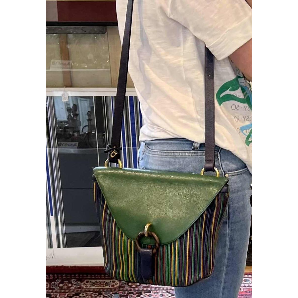 Veelkleurige geweven lederen tas met groen/blauwe nerven.