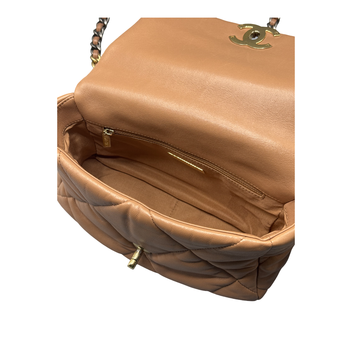 Chanel. Tas 19 in glanzend camel lamsleer met drievoudige hardware: goud, zilver en brons, met schouderband en handvat. Afmetingen: 26 x 19 x 9 cm, schouderband: 110 cm.
