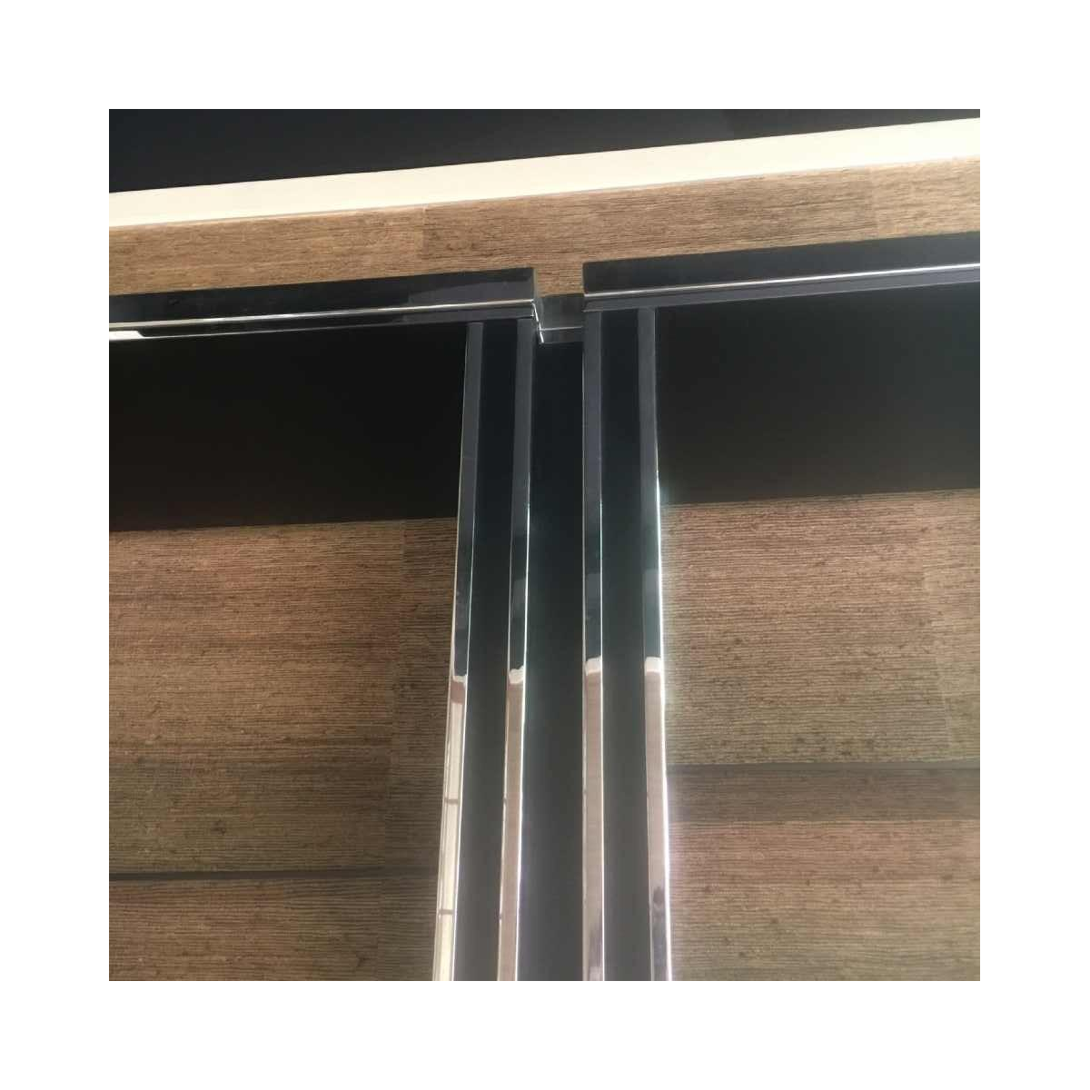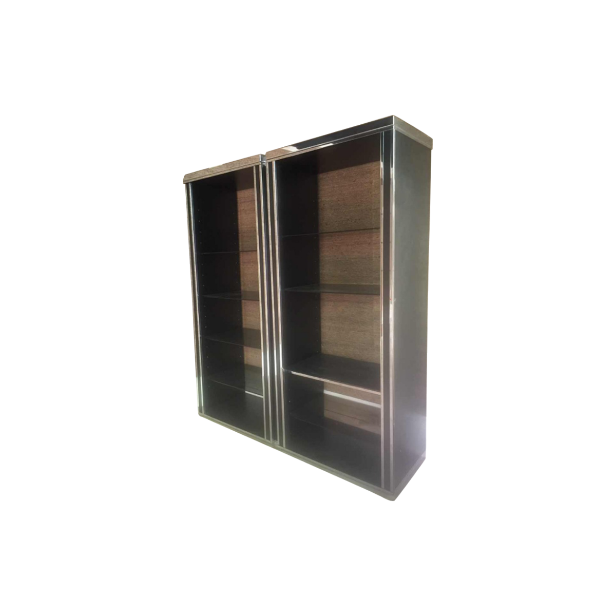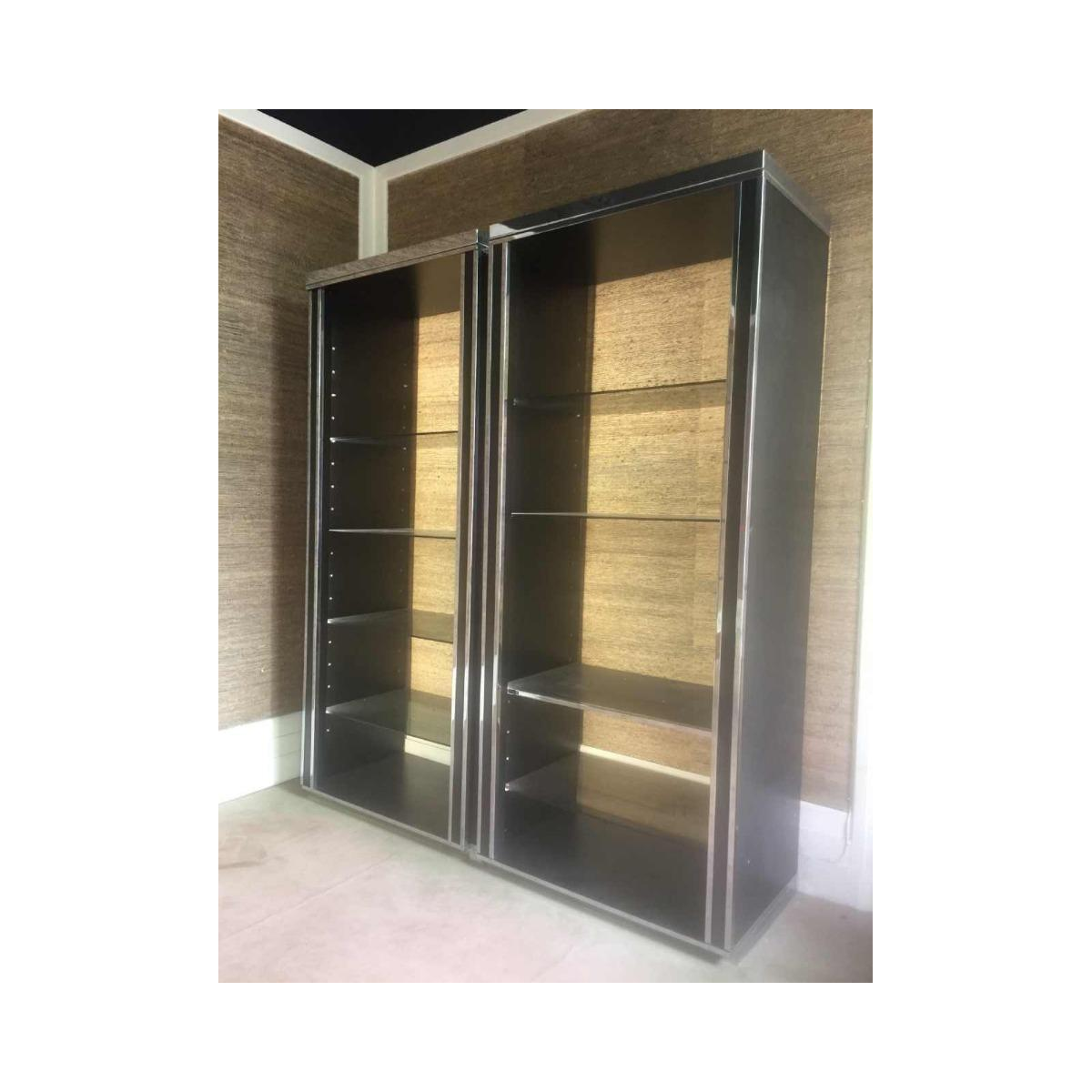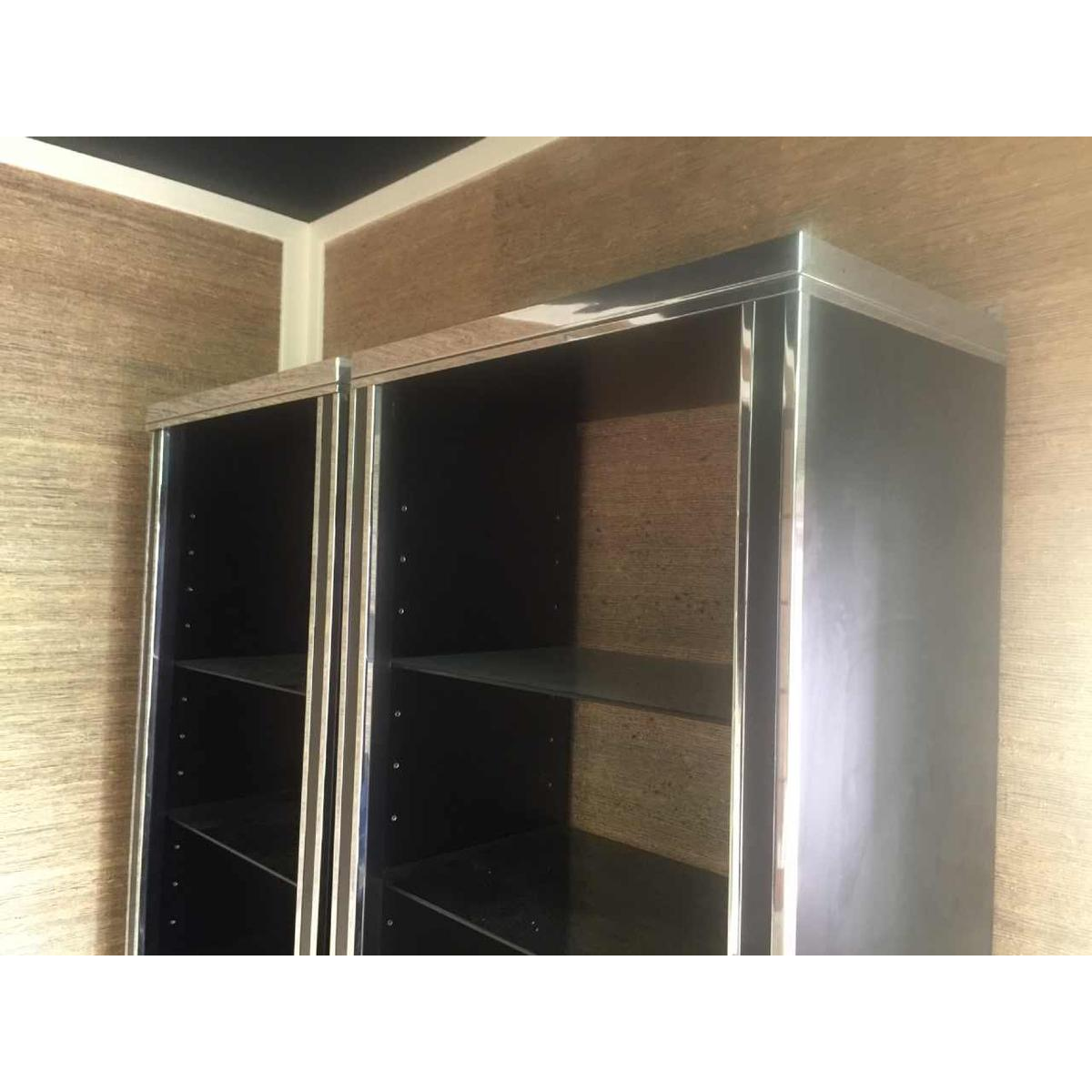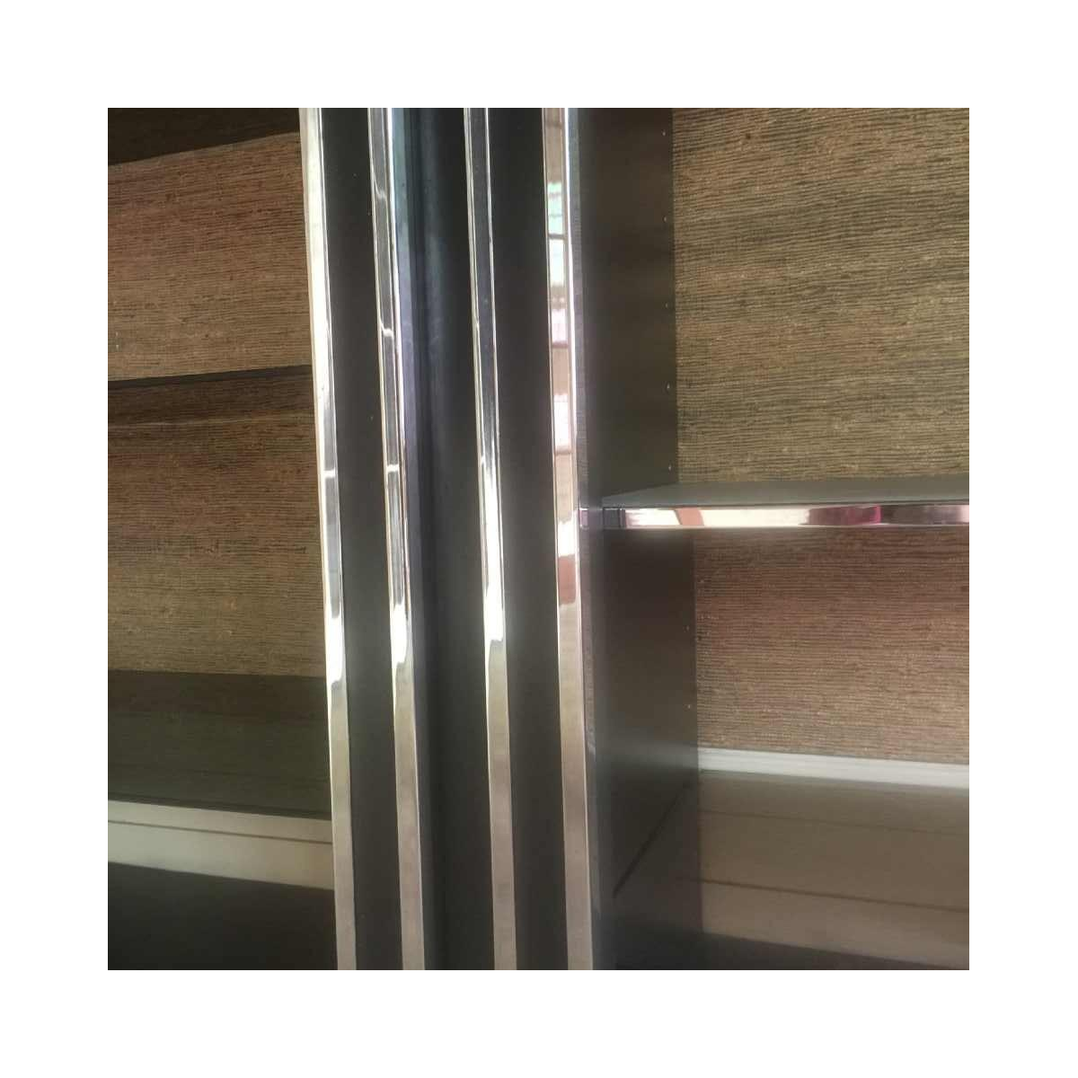 Grote dubbele plank / vitrine / boekenkast in gelamineerd hout en lijstwerk in verchroomd metaal.