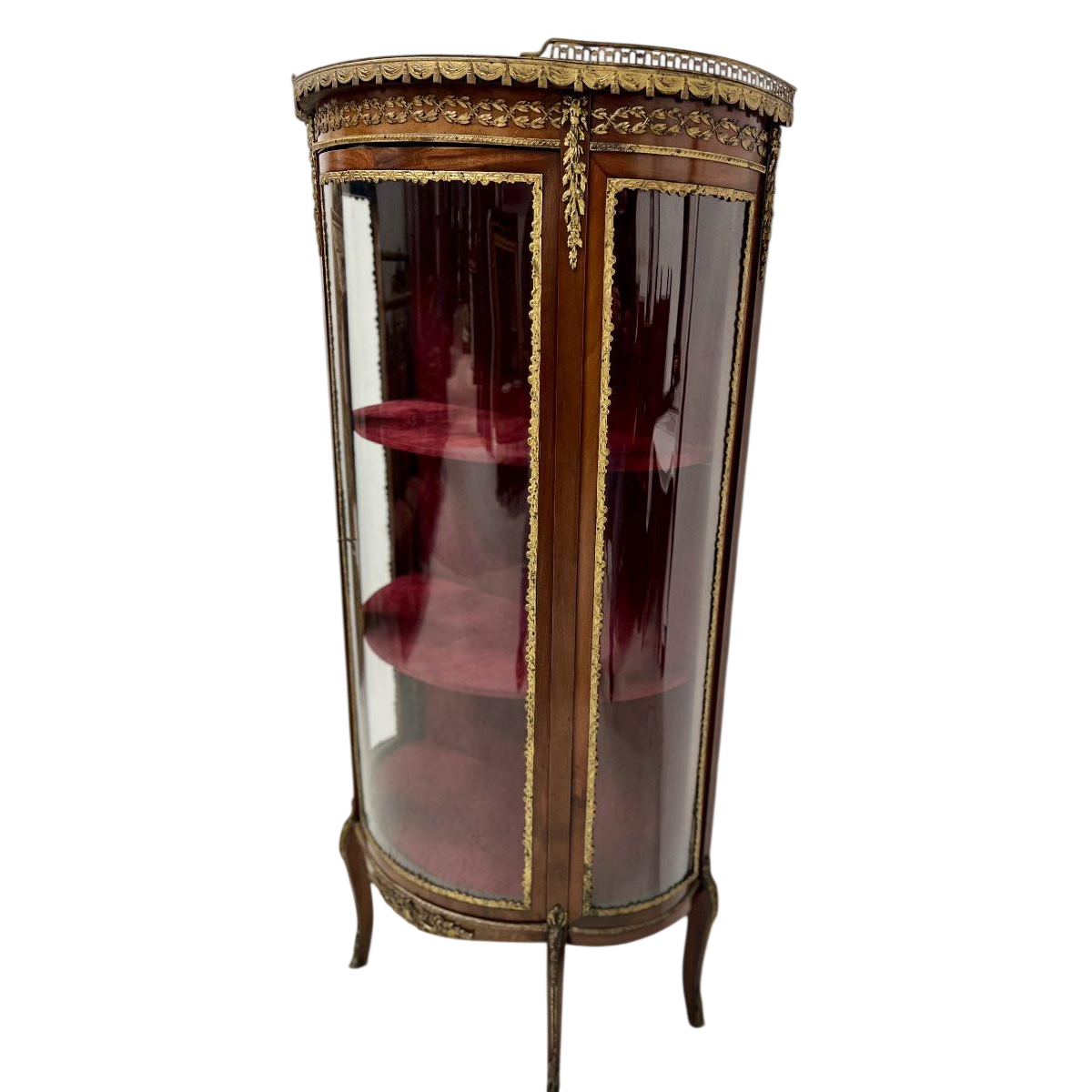 Een gebogen vitrinekast in de stijl van Napoleon III, gemaakt van mahoniehout en fineer, 20e eeuw.
