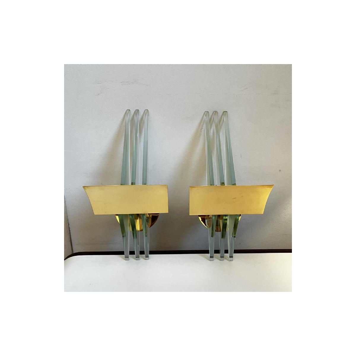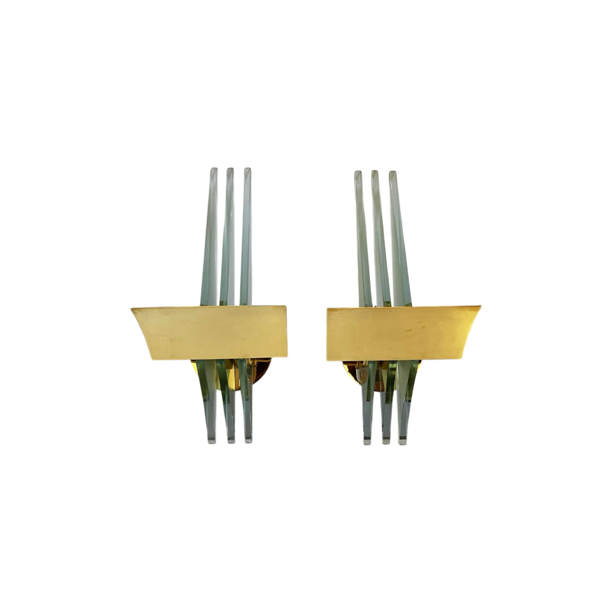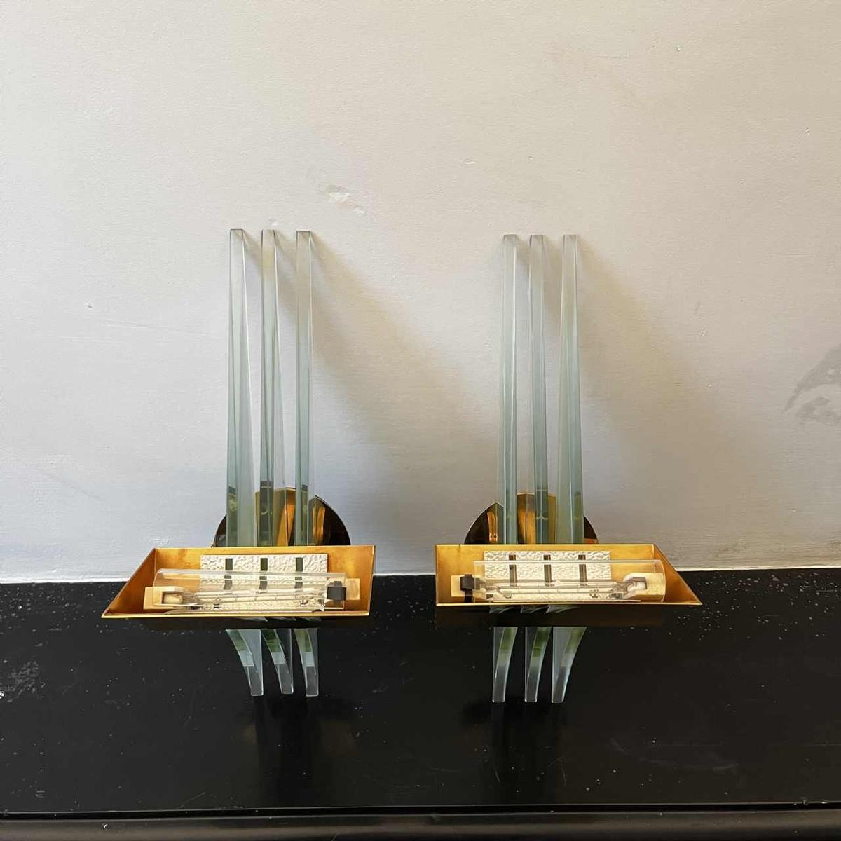 Paar Hollywood Regency wandlampen, verguld messing voet en reflectoren, dikke glazen panelen, ca 1970