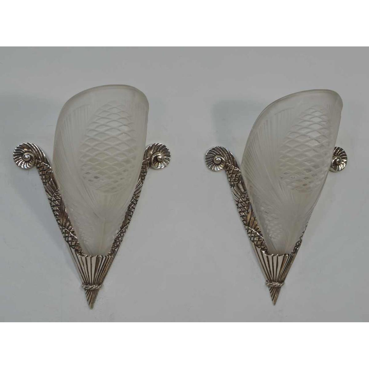 L.Vandamme & Degué Een prachtig paar Franse art deco wandlampen. Gemaakt rond 1925-1930. De twee glazen in geperst glas zijn geproduceerd door Degué. Dit model is nooit gesigneerd. Maar is te zien in de oude Degué product catalogus, model #500. Dit model wandlamp werd gemaakt door Louis Vandamme en staat vermeld in de Vandamme catalogus. Louis Vandamme was een producent van bronzen en smeedijzeren art deco verlichtingsarmaturen gedurende het interbellum in Parijs. De wandlampen zijn 31,3 cm hoog, 20,2 cm breed en 15,5cm diep. Ze zijn in uitstekende staat. Ik heb de bronzen of massief messing monturen opnieuw vernikkeld en gepatineerd. Ze zijn nieuw bedraad en voorzien van E14 fittingen, geschikt voor moderne lampjes, ik zal twee goede kwaliteit LED lampjes toevoegen. De lampen worden per post verzonden. Veilig verpakt en volledig verzekerd. Gratis verzending aangeboden voor België Frankrijk Nederland of Duitsland. Afhalen in Rotterdam is ook mogelijk.