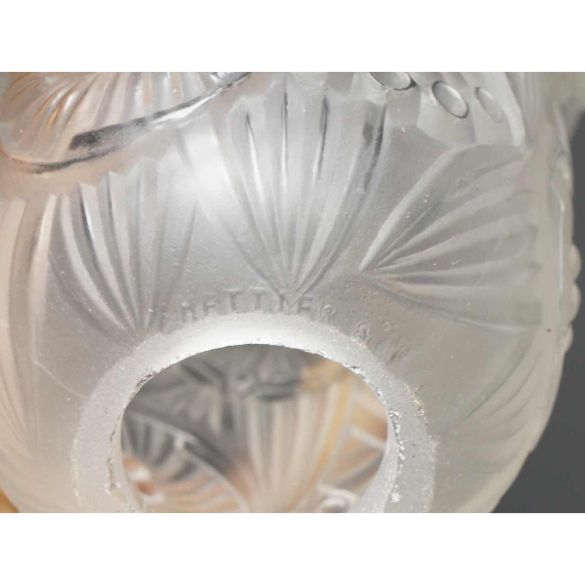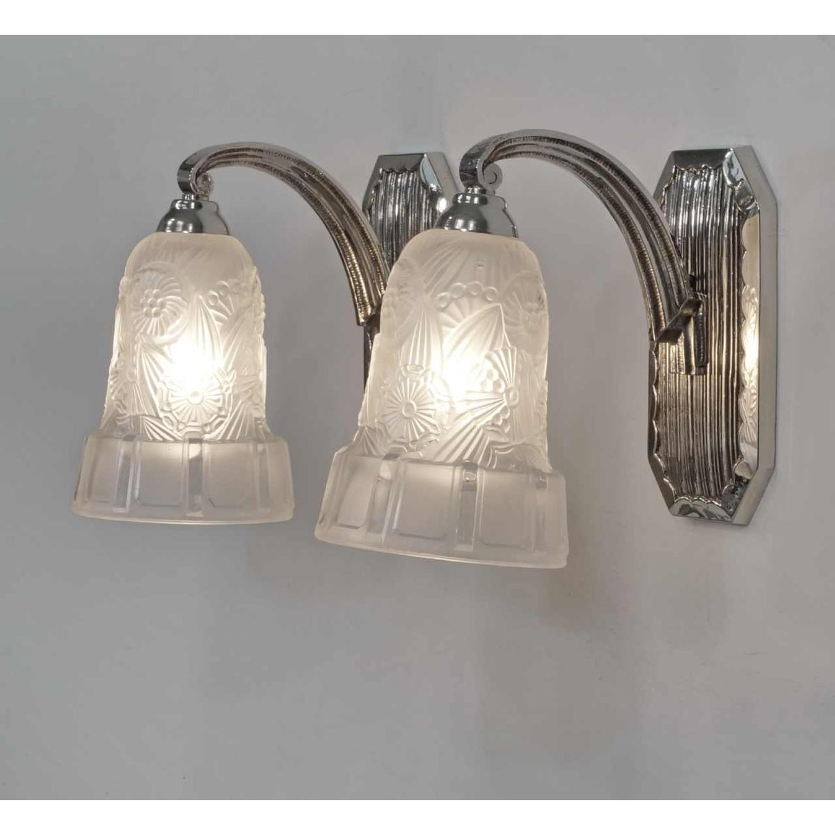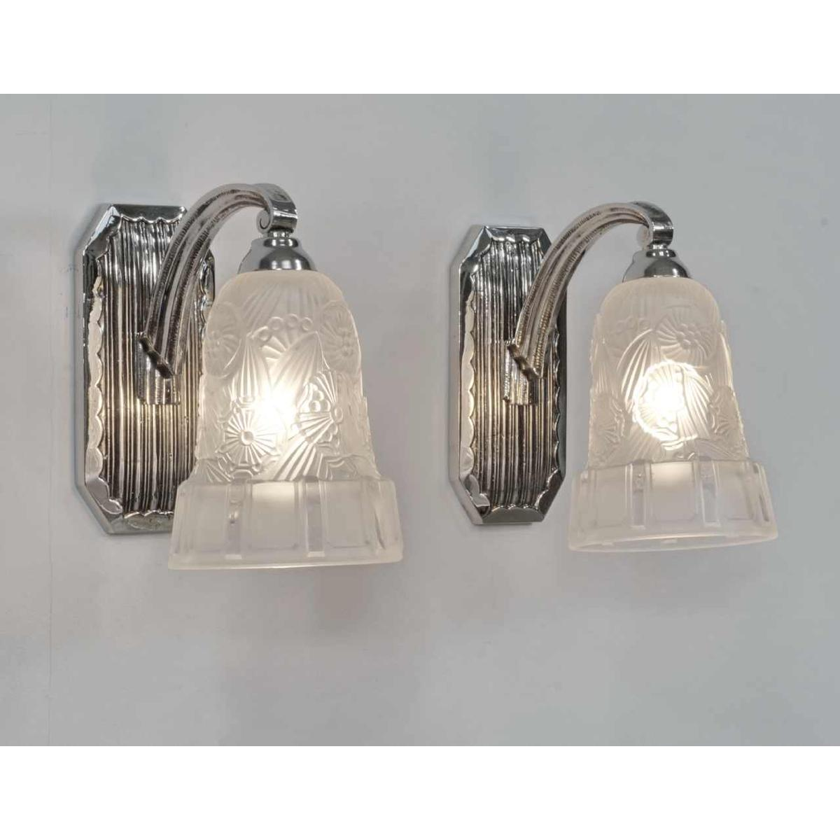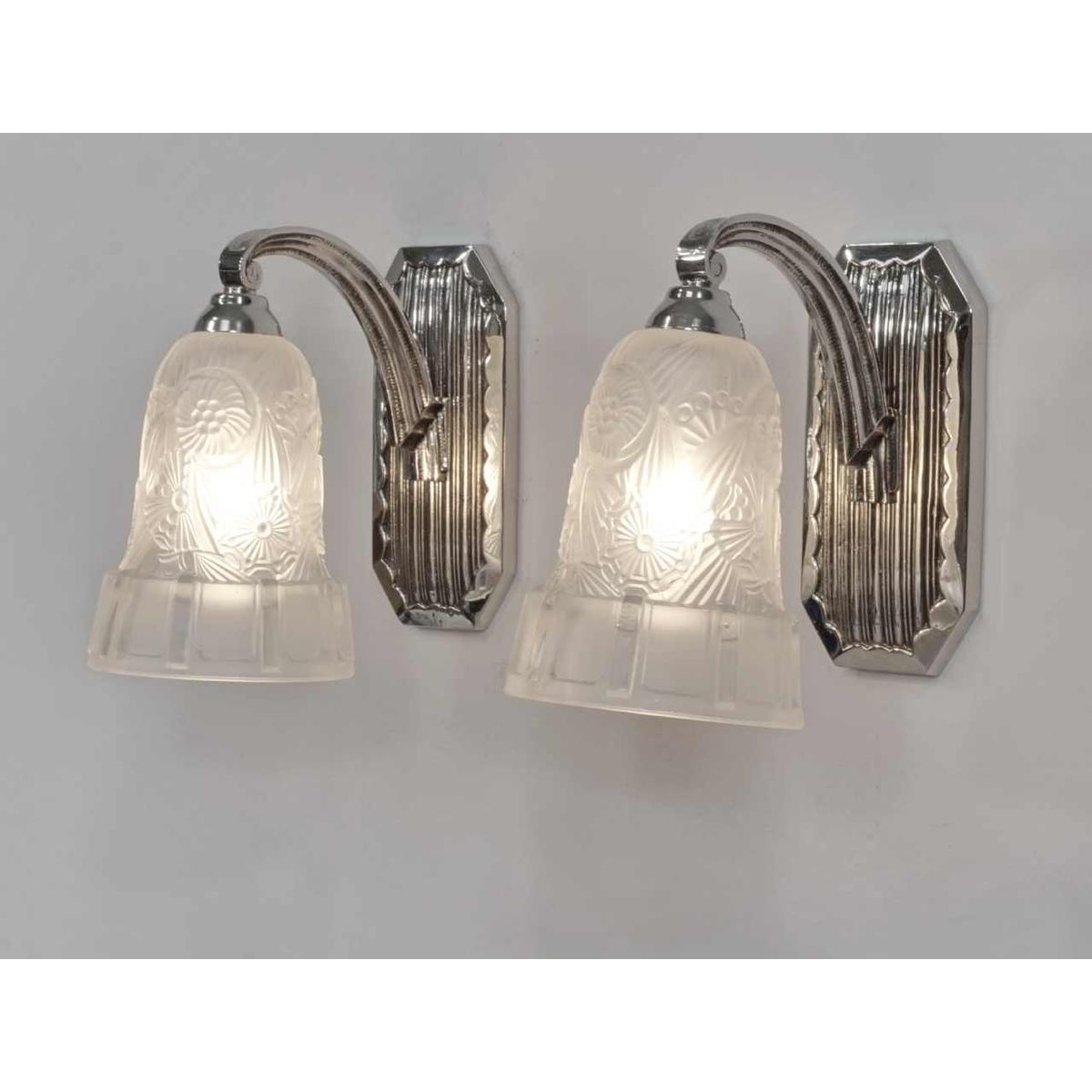 Een prachtig paar Franse art deco wandlampen. Gemaakt rond 1925-1930 in vernikkeld massief messing of brons met lampenkapjes in geperst glas. Beiden zijn gesigneerd Hettier & Vincent France, vlakbij het gat aan de bovenkant van het glas. Dit gat werd na het gieten in de fabriek vlak geslepen, waardoor de signatuur bijna altijd gedeeltelijk of soms bijna volledig werd weggeslepen. De lampenkappen in geperst glas met de signatuur van Hettier et Vincent werden voor HetV gemaakt door Verreries des Hanots. Hanots was naast het merk Verlys één van de artistieke takken van de grote industriële glasfabriek Holophane.