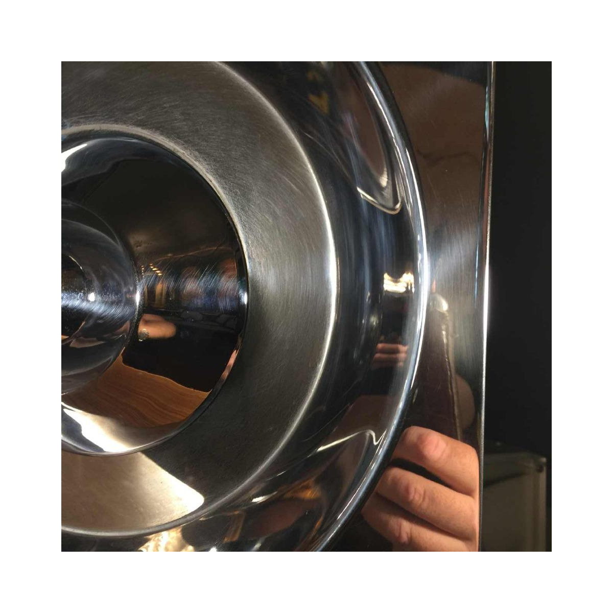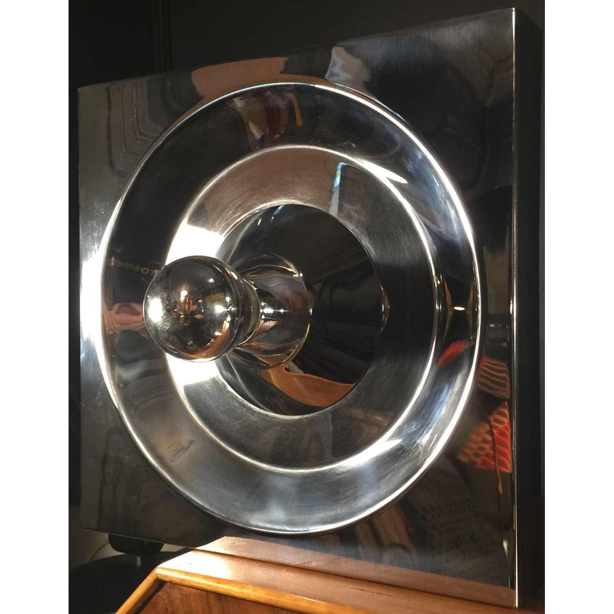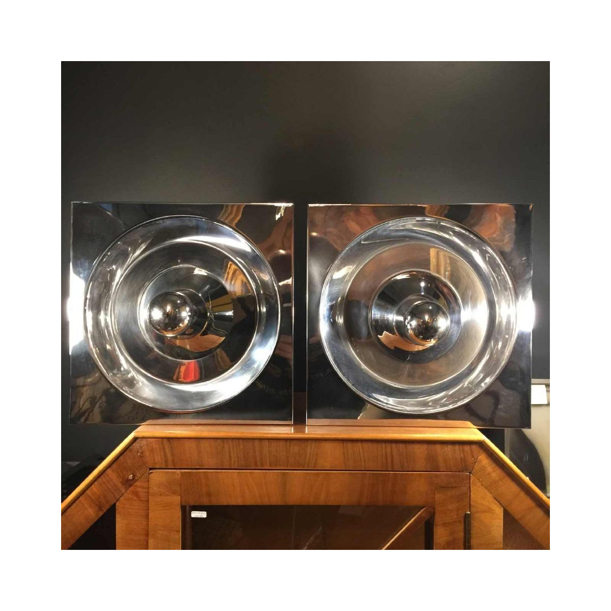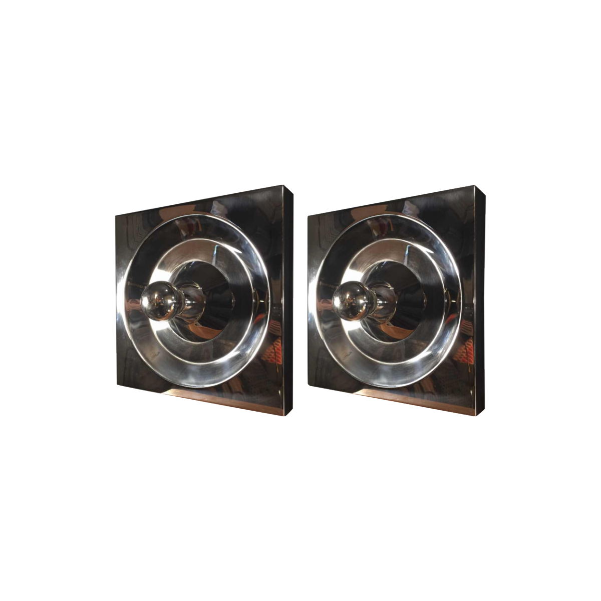 Deze wandlampen zijn gemaakt van hoogwaardig verchroomd staal en zijn zeldzaam. Vierkant gevormd, met een ronde uitsparing waarin een E16-lamp (standaard) is ondergebracht, heeft deze holte het effect van een ongewoon lichtspel.