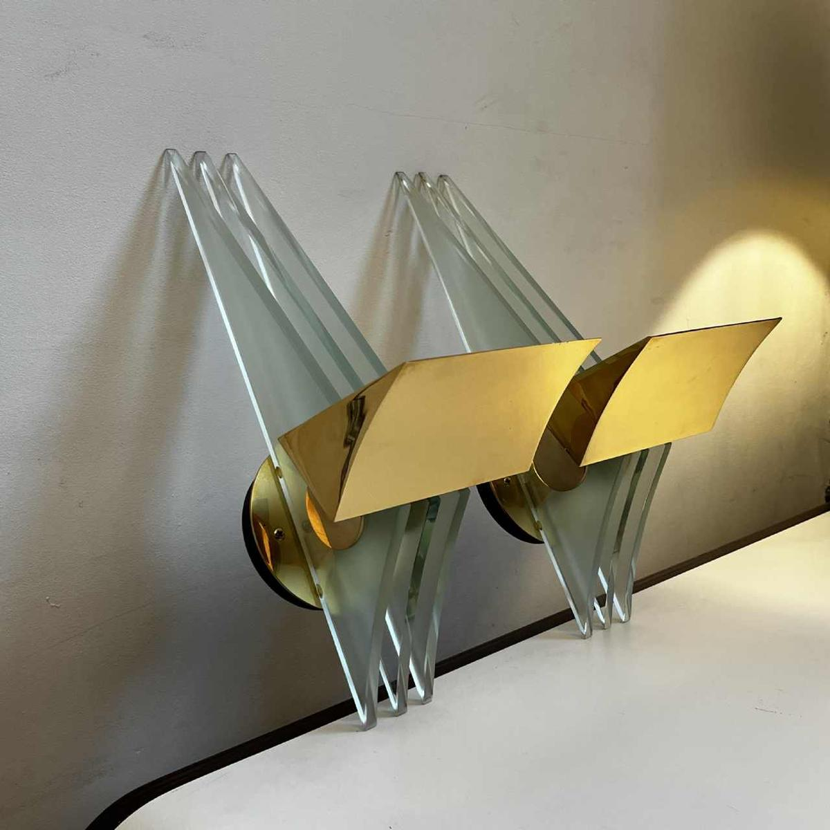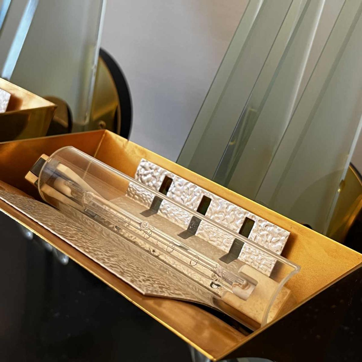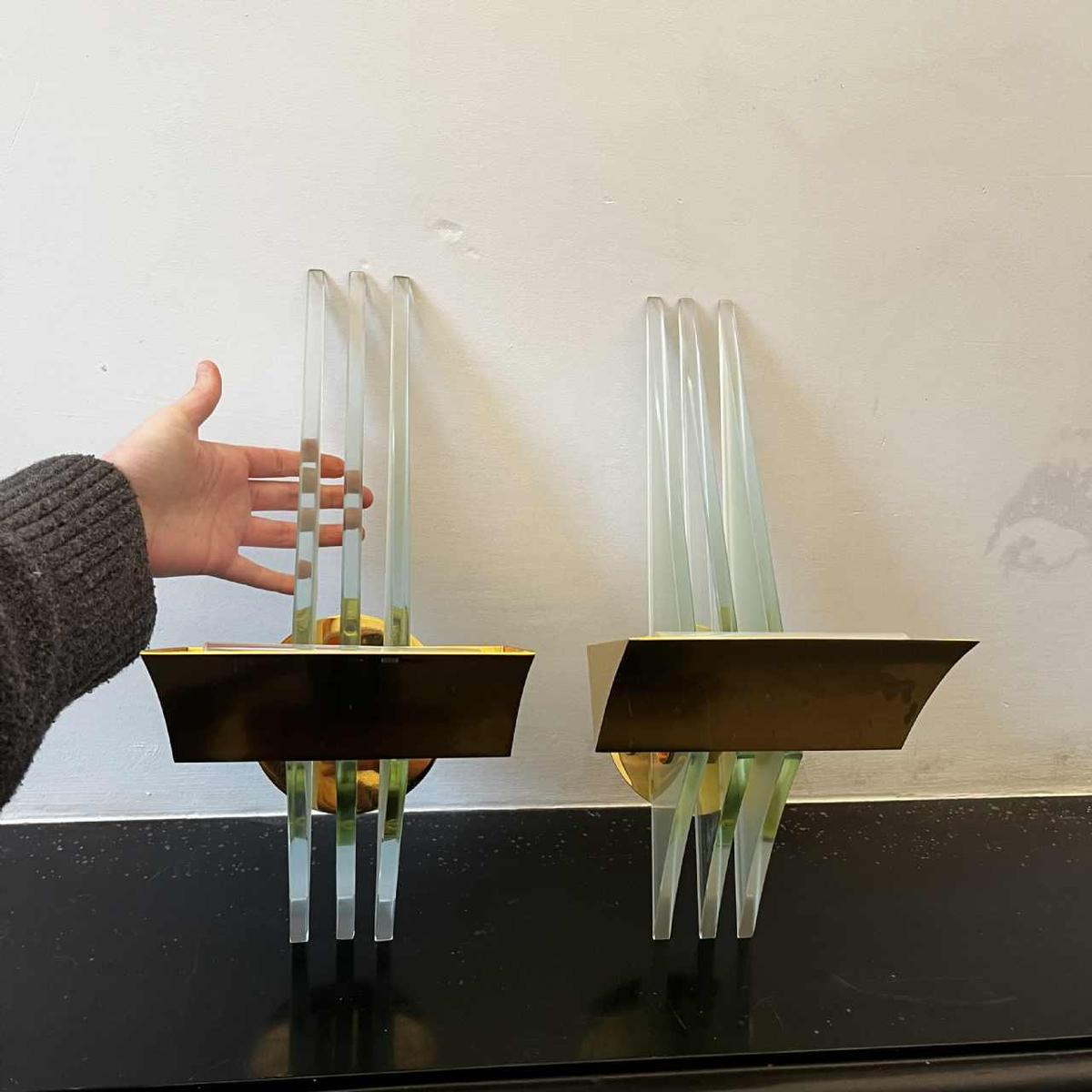 Paar Hollywood Regency wandlampen, verguld messing voet en reflectoren, dikke glazen panelen, ca 1970