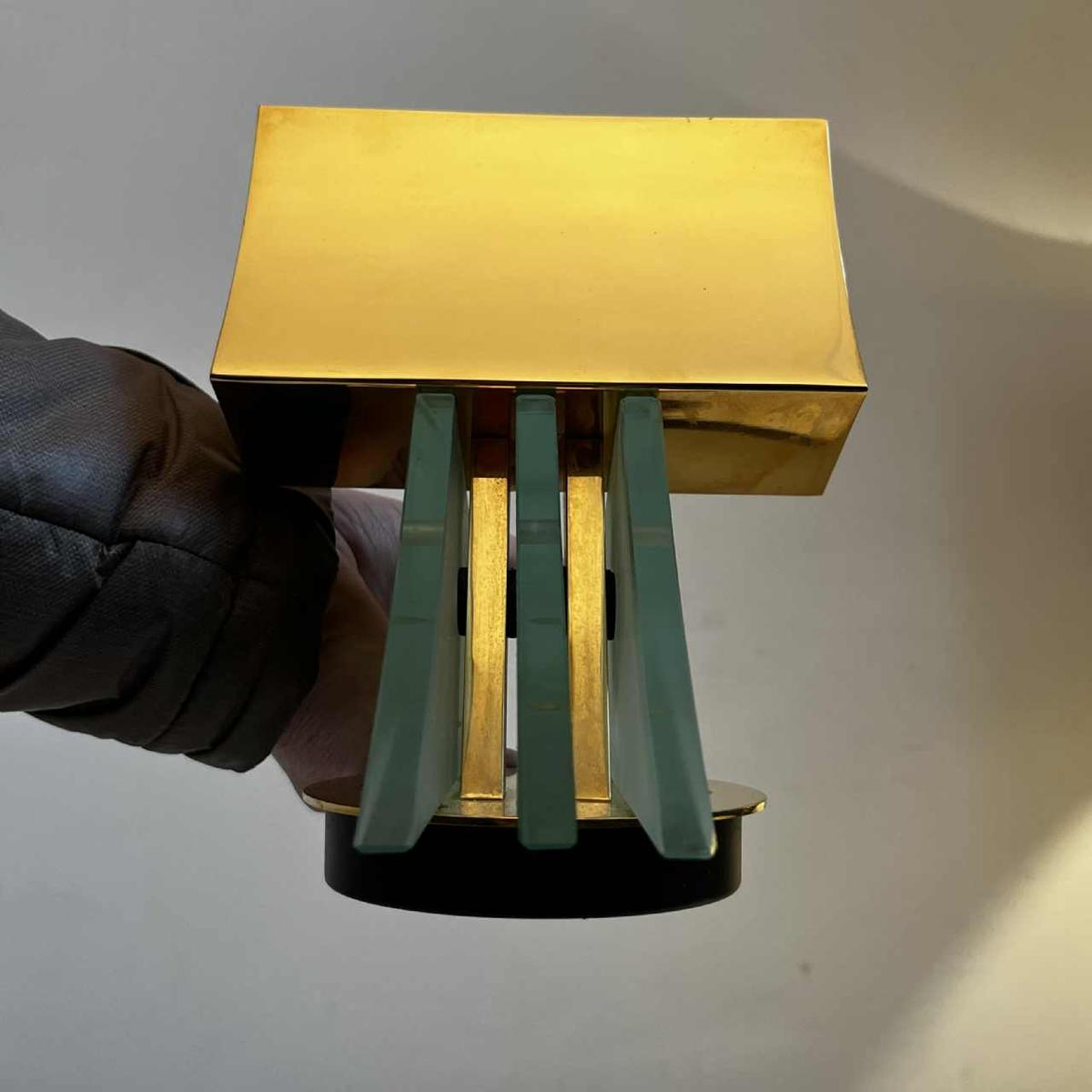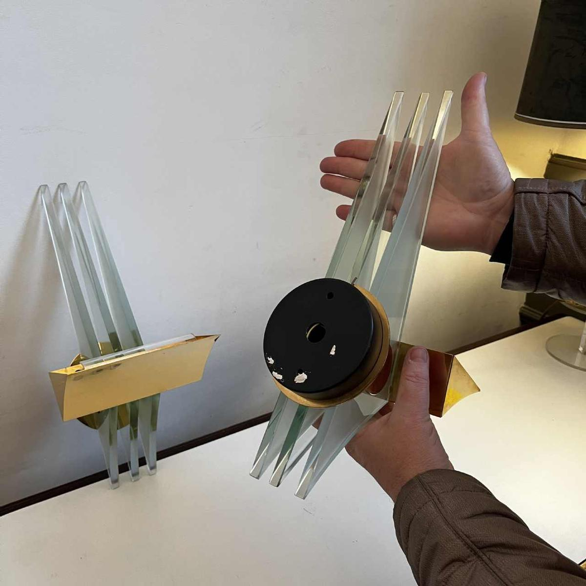 This form is only used to notify us of illegal content on product: Paar Hollywood Regency wandlampen, verguld messing voet en reflectoren, dikke glazen panelen, ca 1970.