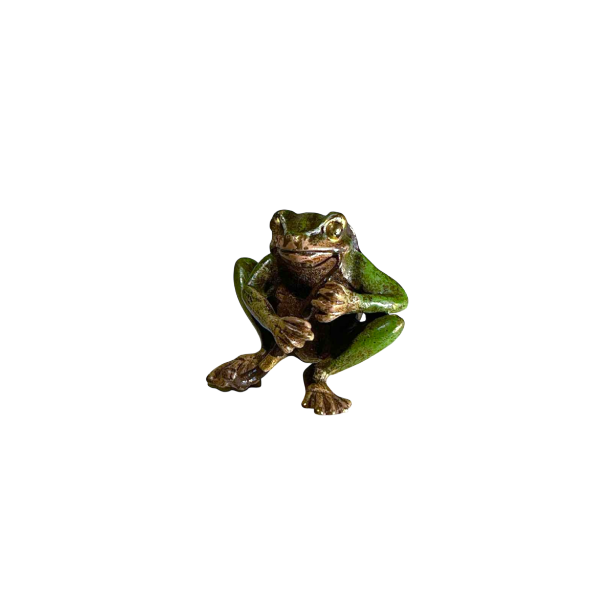 Kleine gepatineerde bronzen sculptuur van een muzikale kikker, vervaardigd in de traditie van de Weense bronzen (Vienna Bronzes), circa 1900.