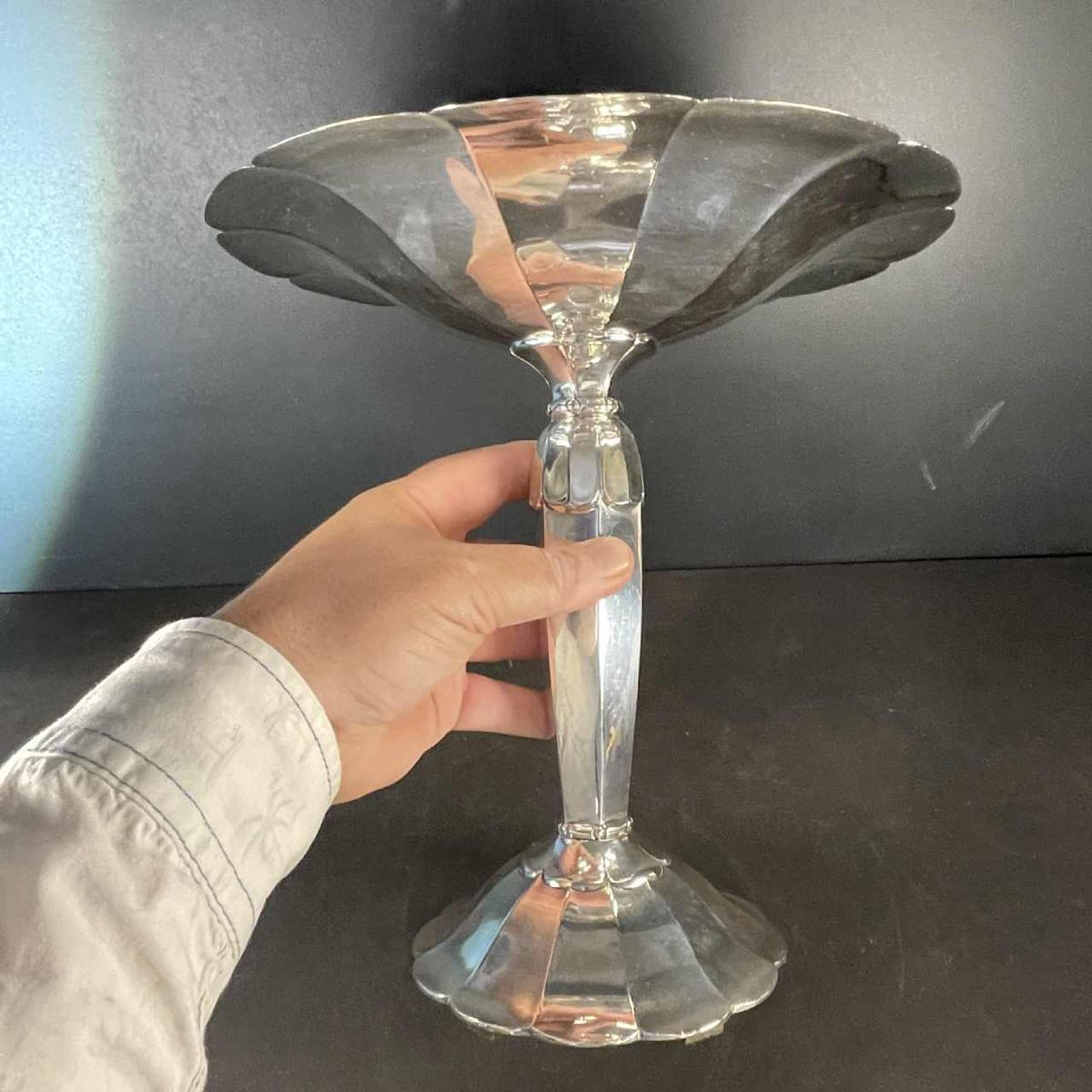Fruitschaal, koekjesschaal of zelfs tafelstuk op een standaard gemaakt van hoogwaardig zilvermetaal, Maillechort type ook wel witmetaal of soms Alpaca genoemd, een zilverachtig metaal in de massa dat daarom niet verslijt.